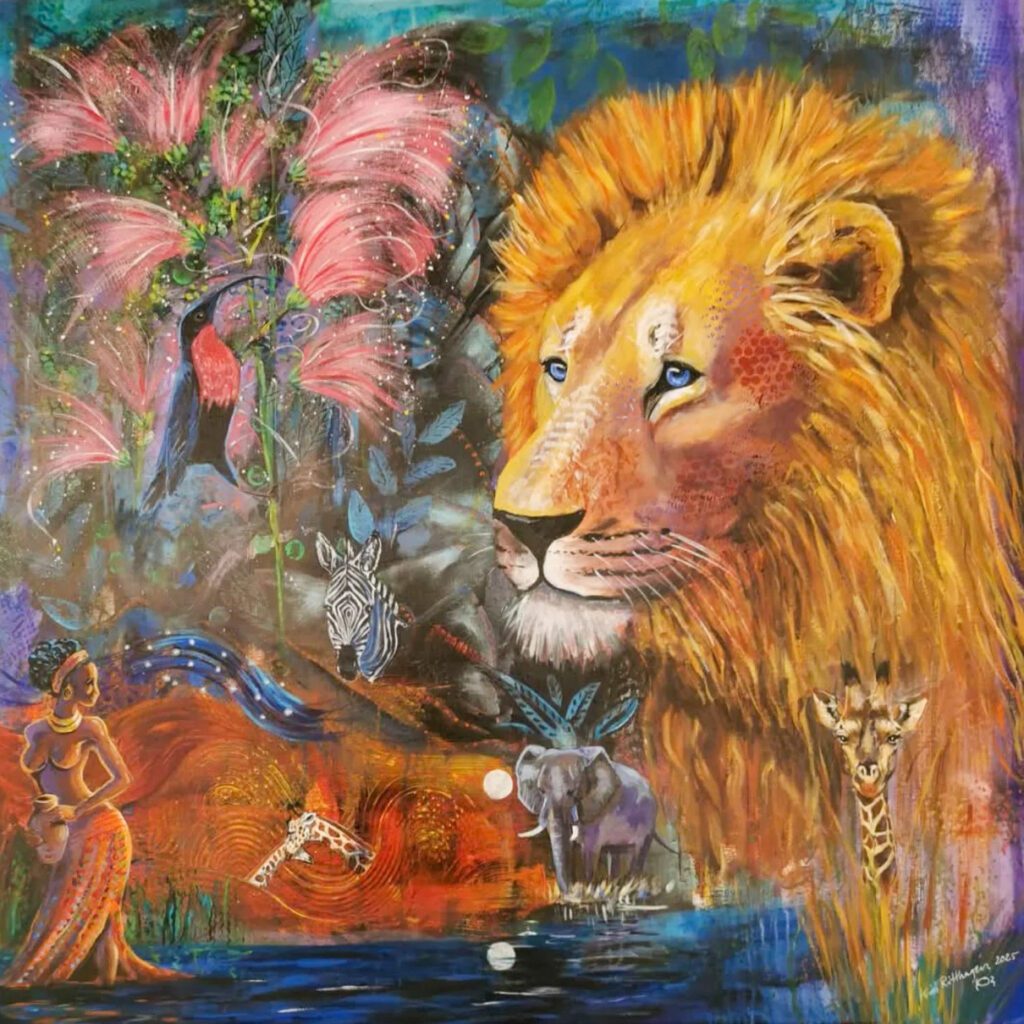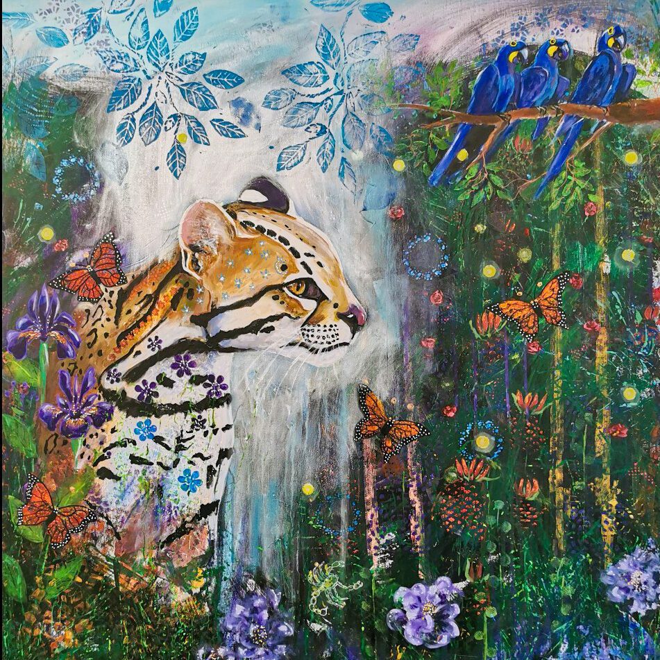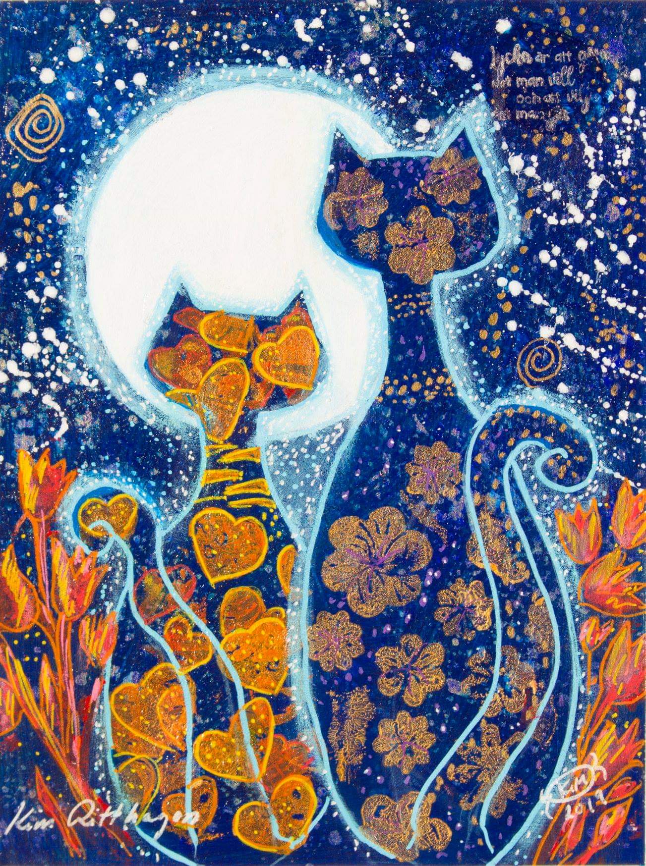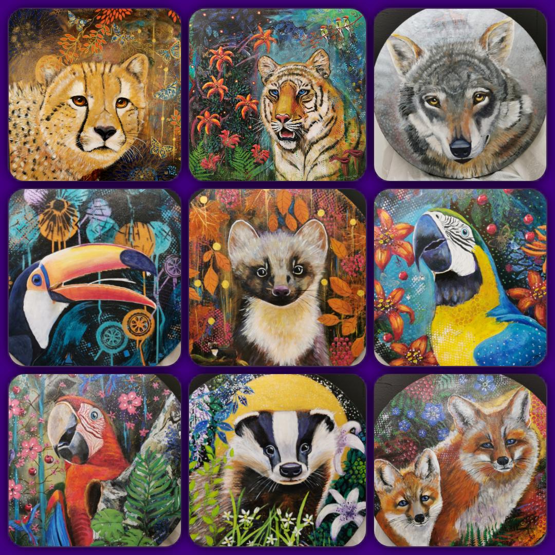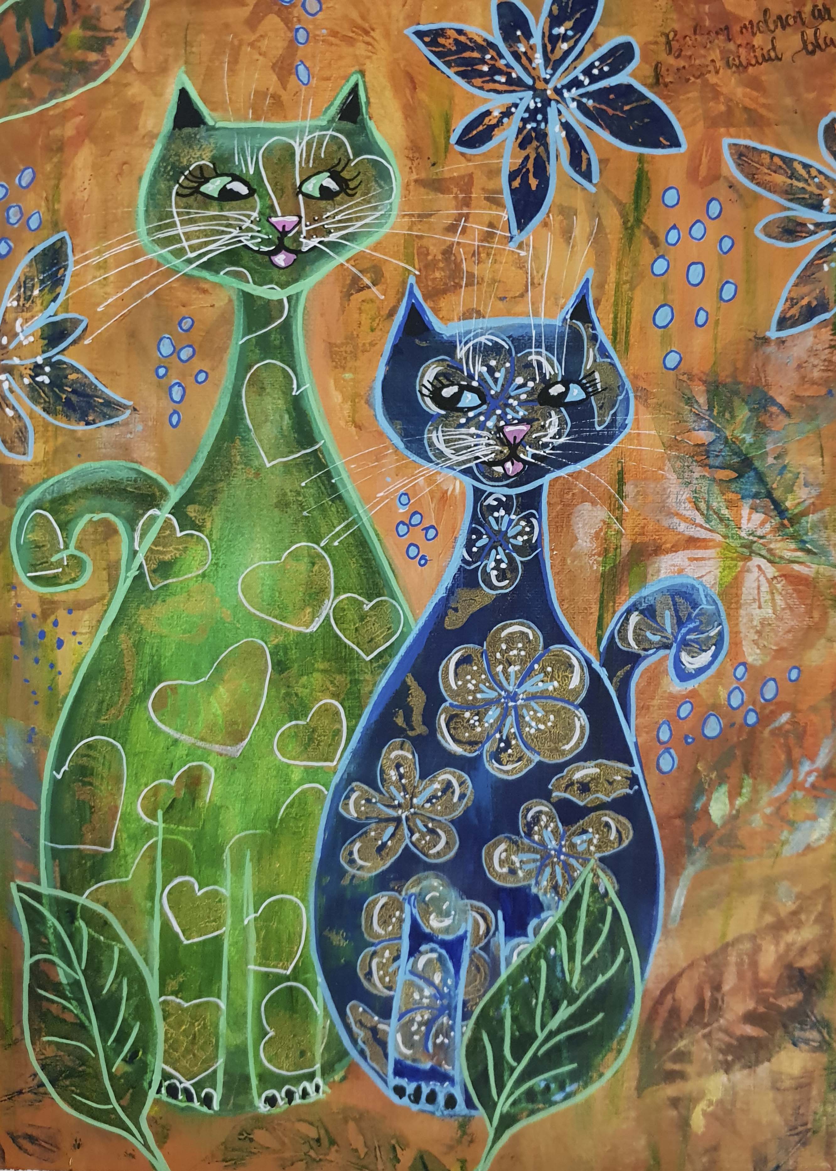 Motiven rör sig mellan natur, mytologi, djur och katter. Ibland är de kraftfulla och intensiva, ibland stilla och drömska. Jag återkommer ofta till symboler och arketypiska gestalter – fåglar, gudinnor, undervattensvarelser, skogens djur. De bär på något tidlöst, något som känns igen även om man inte kan sätta ord på det. Samtidigt finns det alltid en lekfullhet i mina verk. Färgerna får dansa, formerna får överraska, och ibland dyker det upp en katt som bär både humor och självklar värdighet.