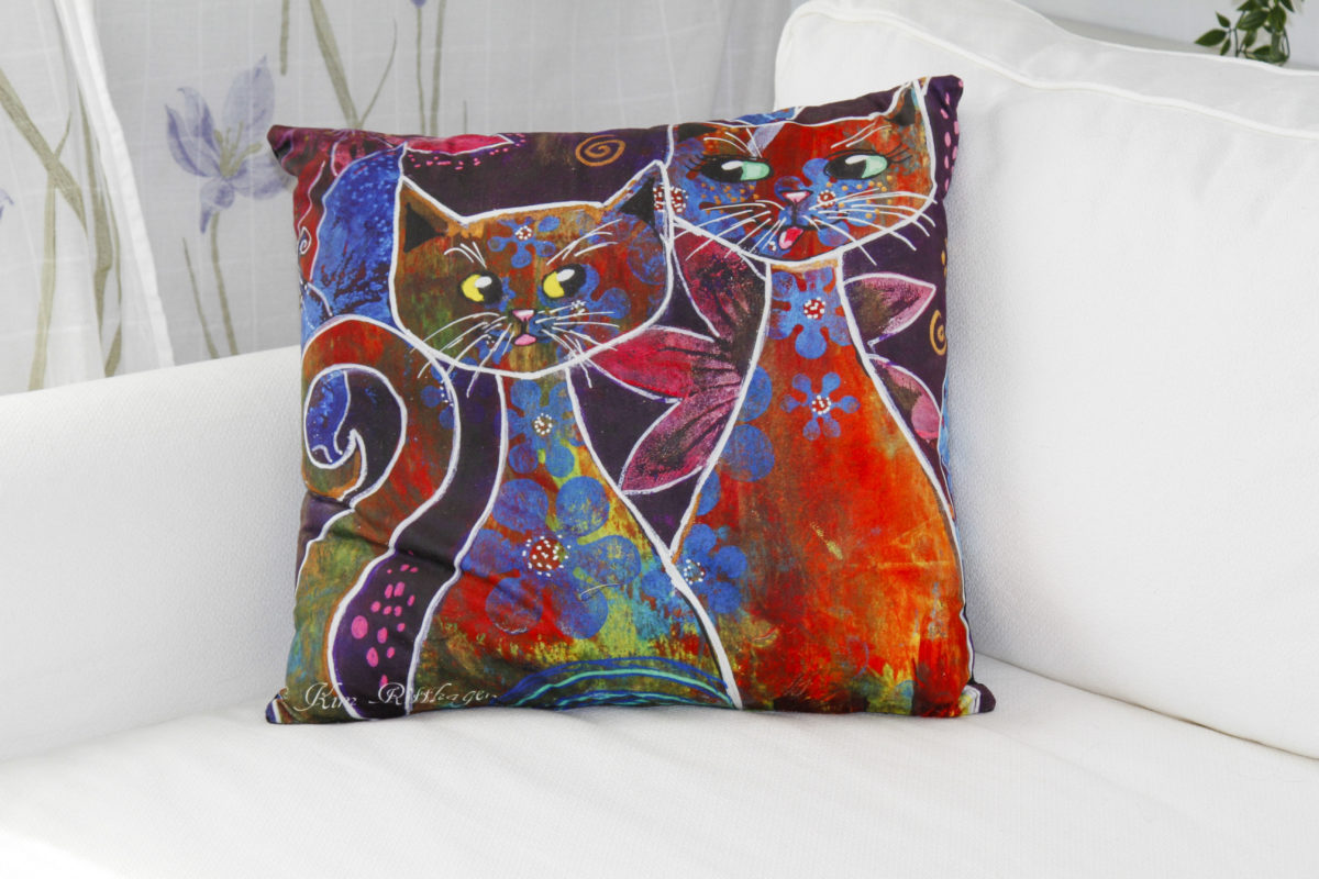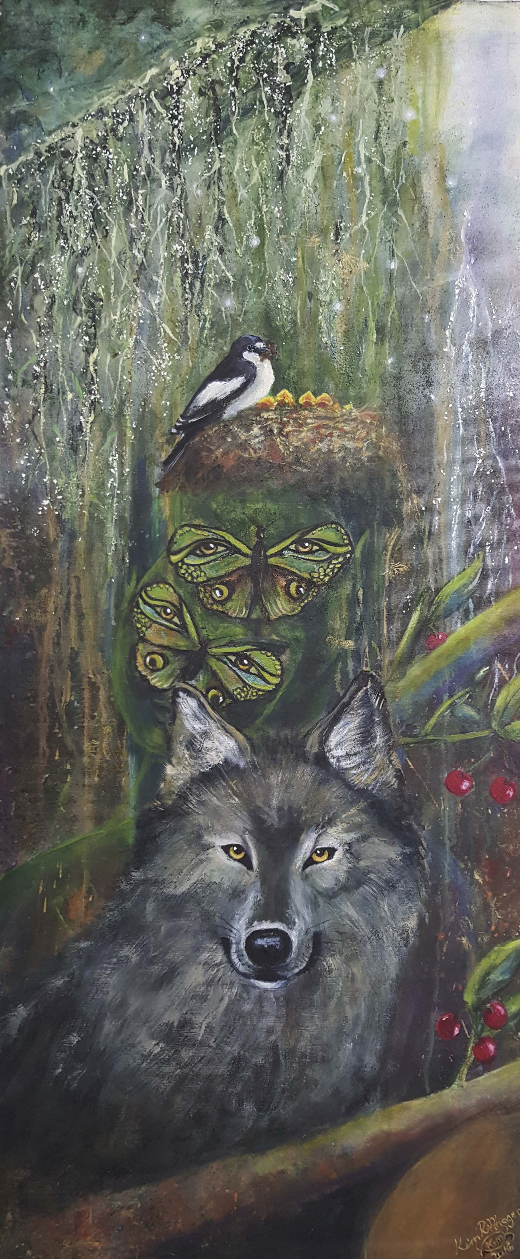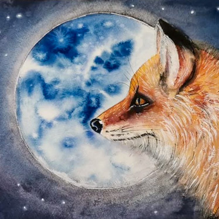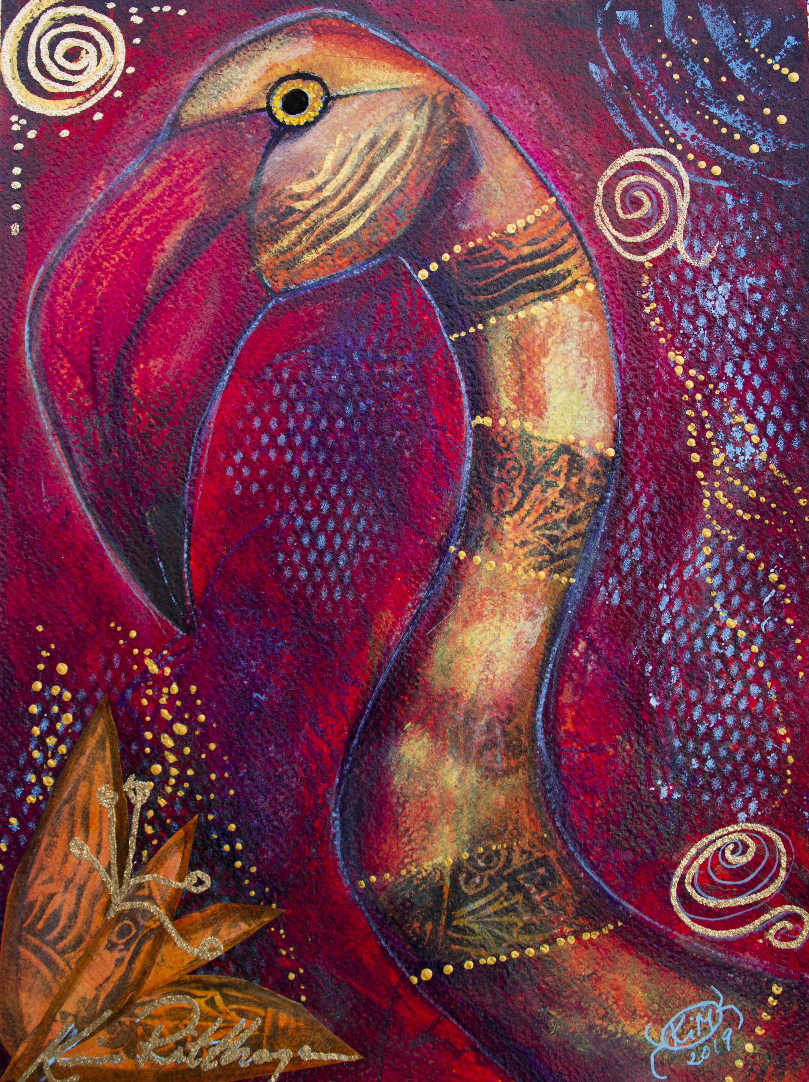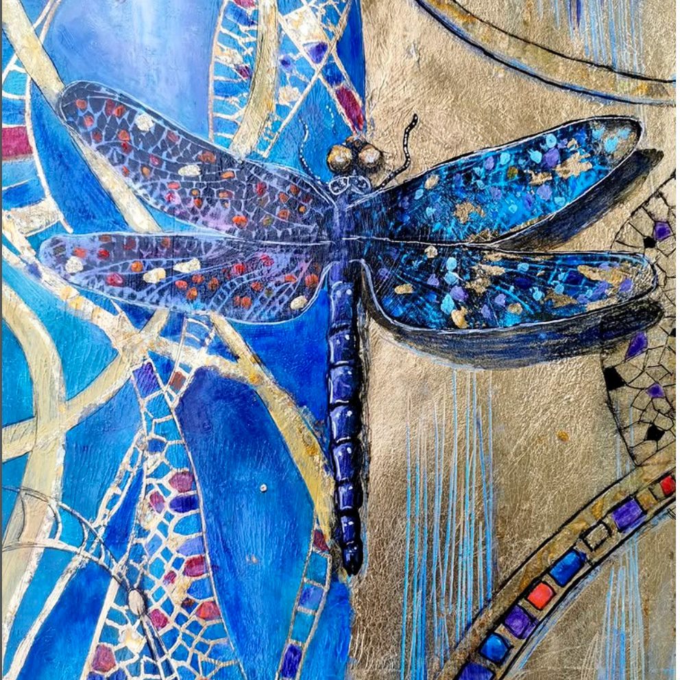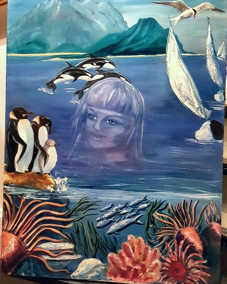 Motiven rör sig mellan natur, mytologi, djur och katter. Ibland är de kraftfulla och intensiva, ibland stilla och drömska. Jag återkommer ofta till symboler och arketypiska gestalter – fåglar, gudinnor, undervattensvarelser, skogens djur. De bär på något tidlöst, något som känns igen även om man inte kan sätta ord på det. Samtidigt finns det alltid en lekfullhet i mina verk. Färgerna får dansa, formerna får överraska, och ibland dyker det upp en katt som bär både humor och självklar värdighet.