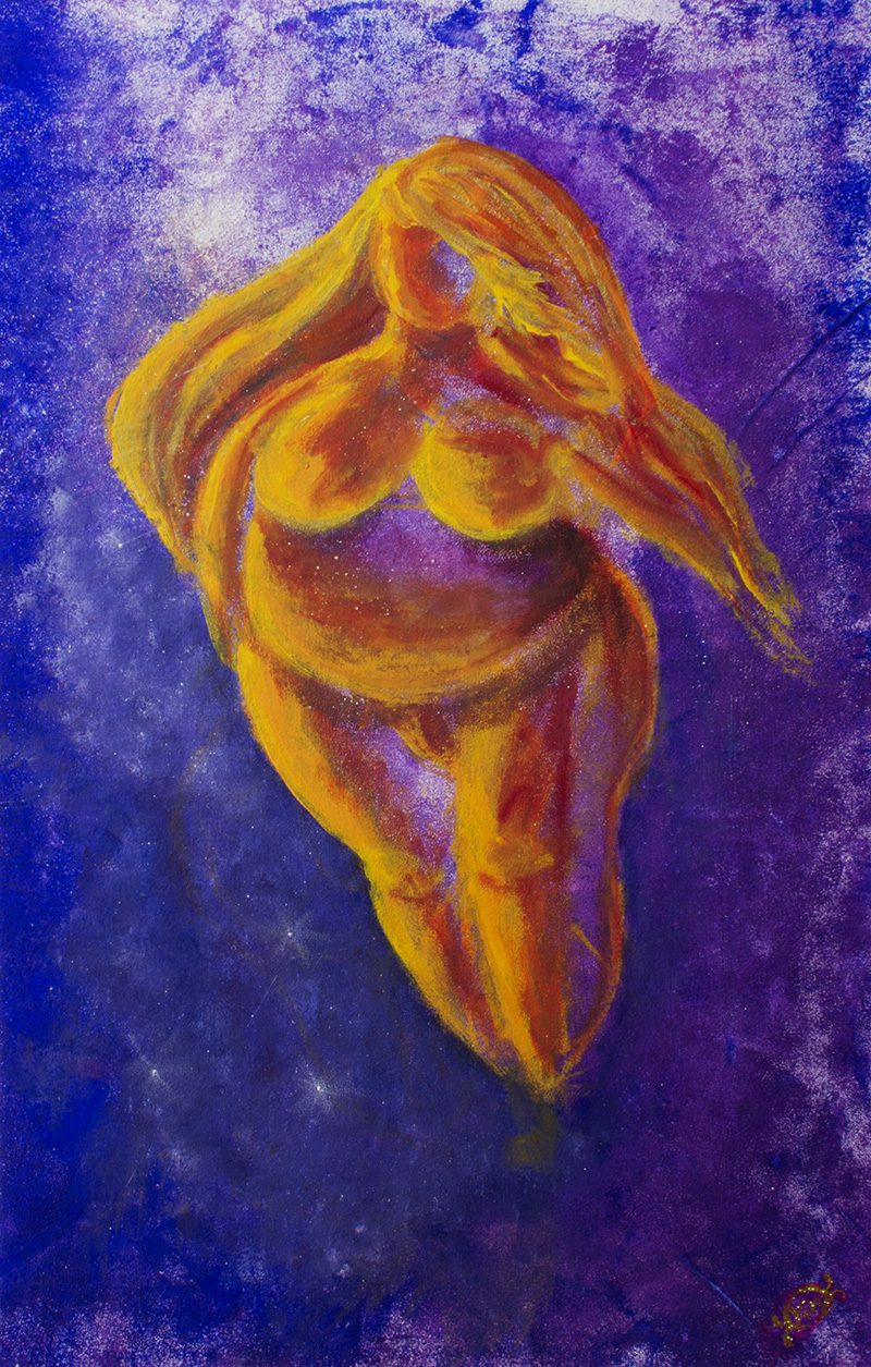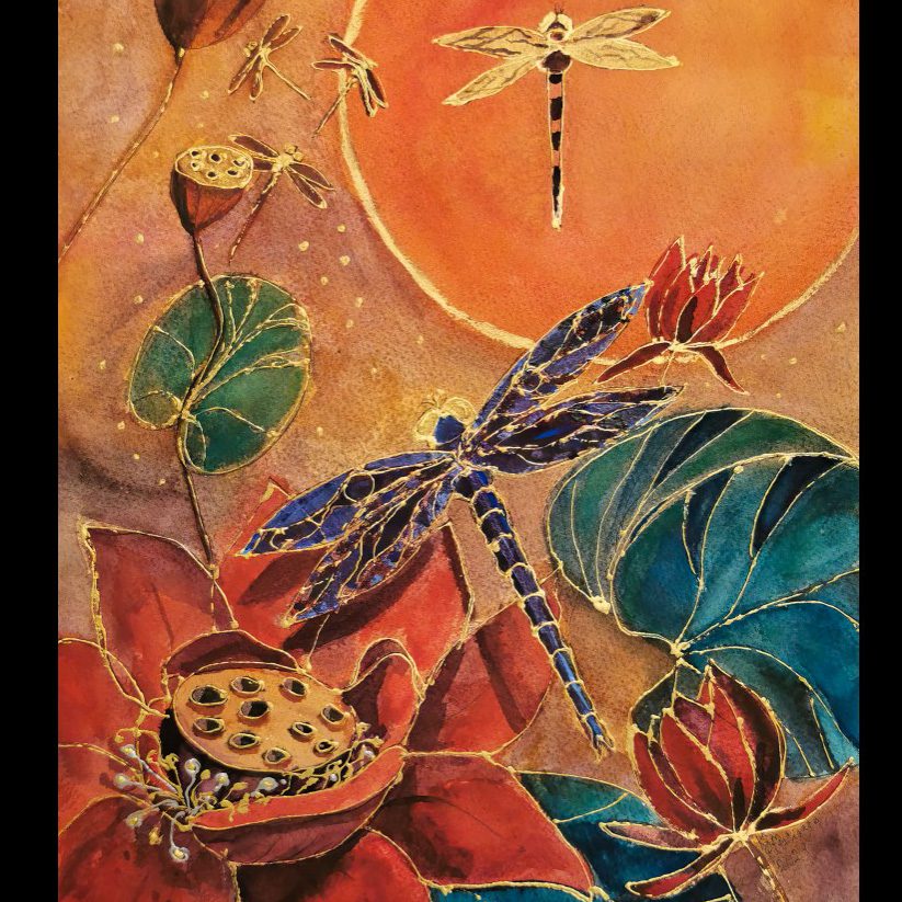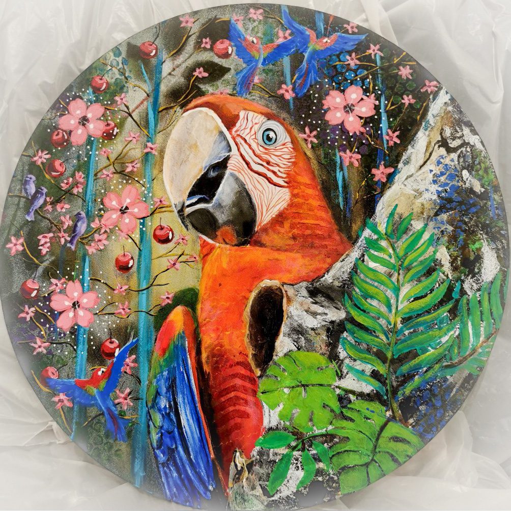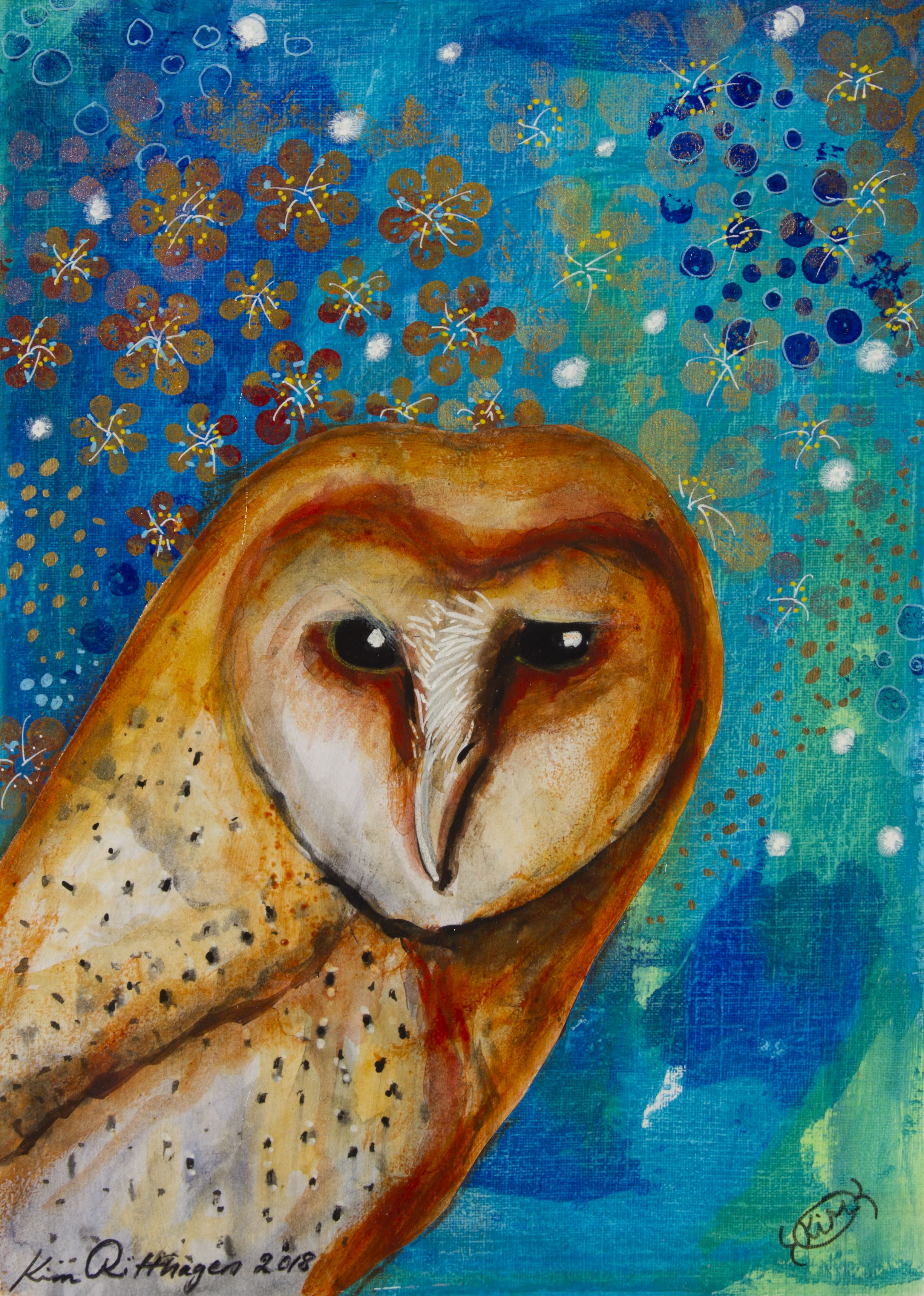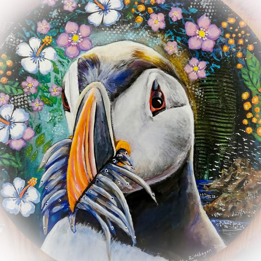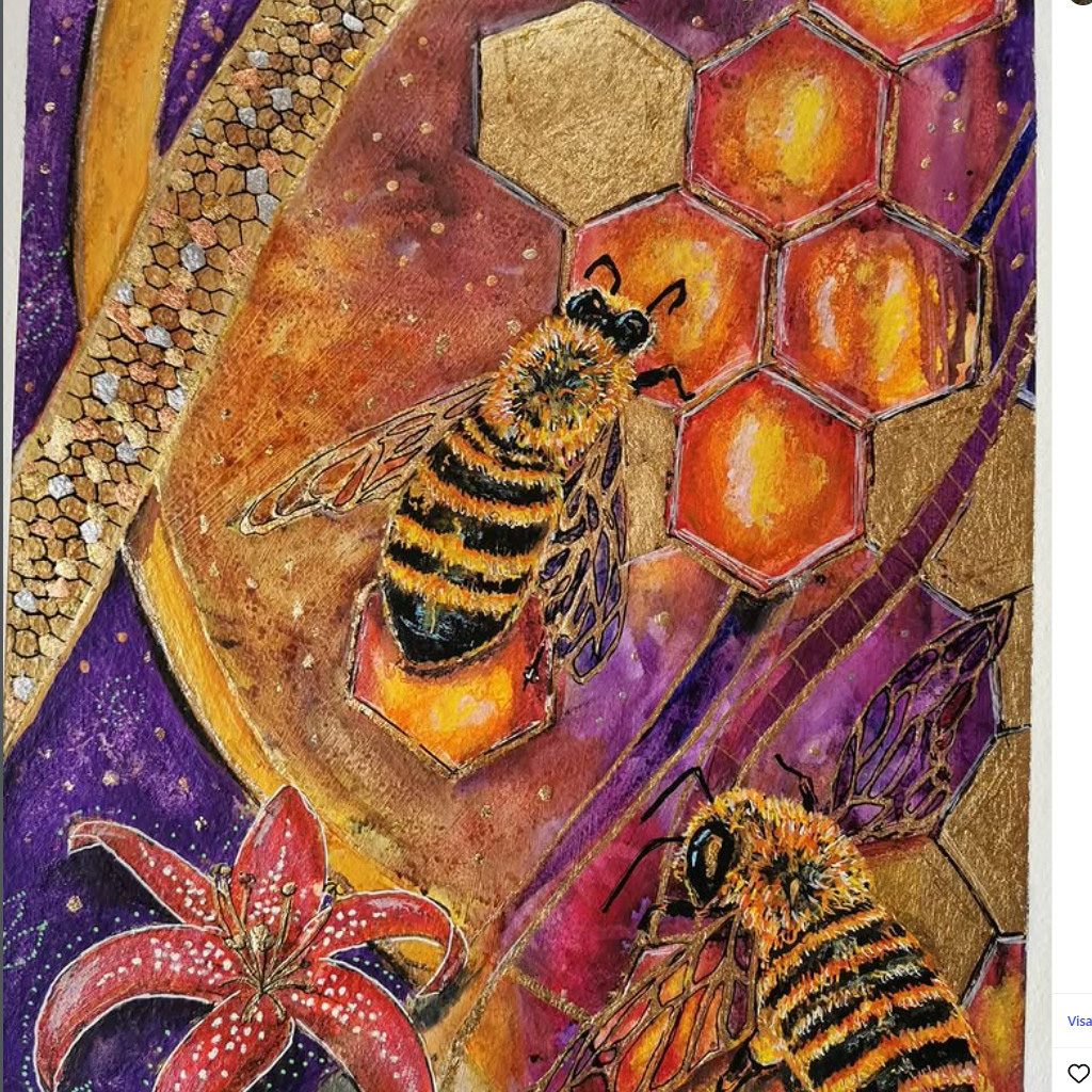 Motiven rör sig mellan natur, mytologi, djur och katter. Ibland är de kraftfulla och intensiva, ibland stilla och drömska. Jag återkommer ofta till symboler och arketypiska gestalter – fåglar, gudinnor, undervattensvarelser, skogens djur. De bär på något tidlöst, något som känns igen även om man inte kan sätta ord på det. Samtidigt finns det alltid en lekfullhet i mina verk. Färgerna får dansa, formerna får överraska, och ibland dyker det upp en katt som bär både humor och självklar värdighet.