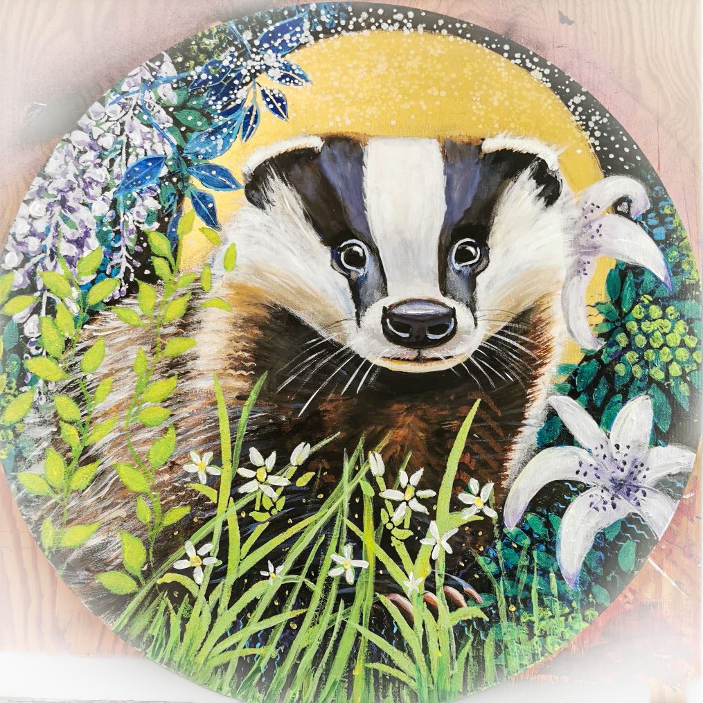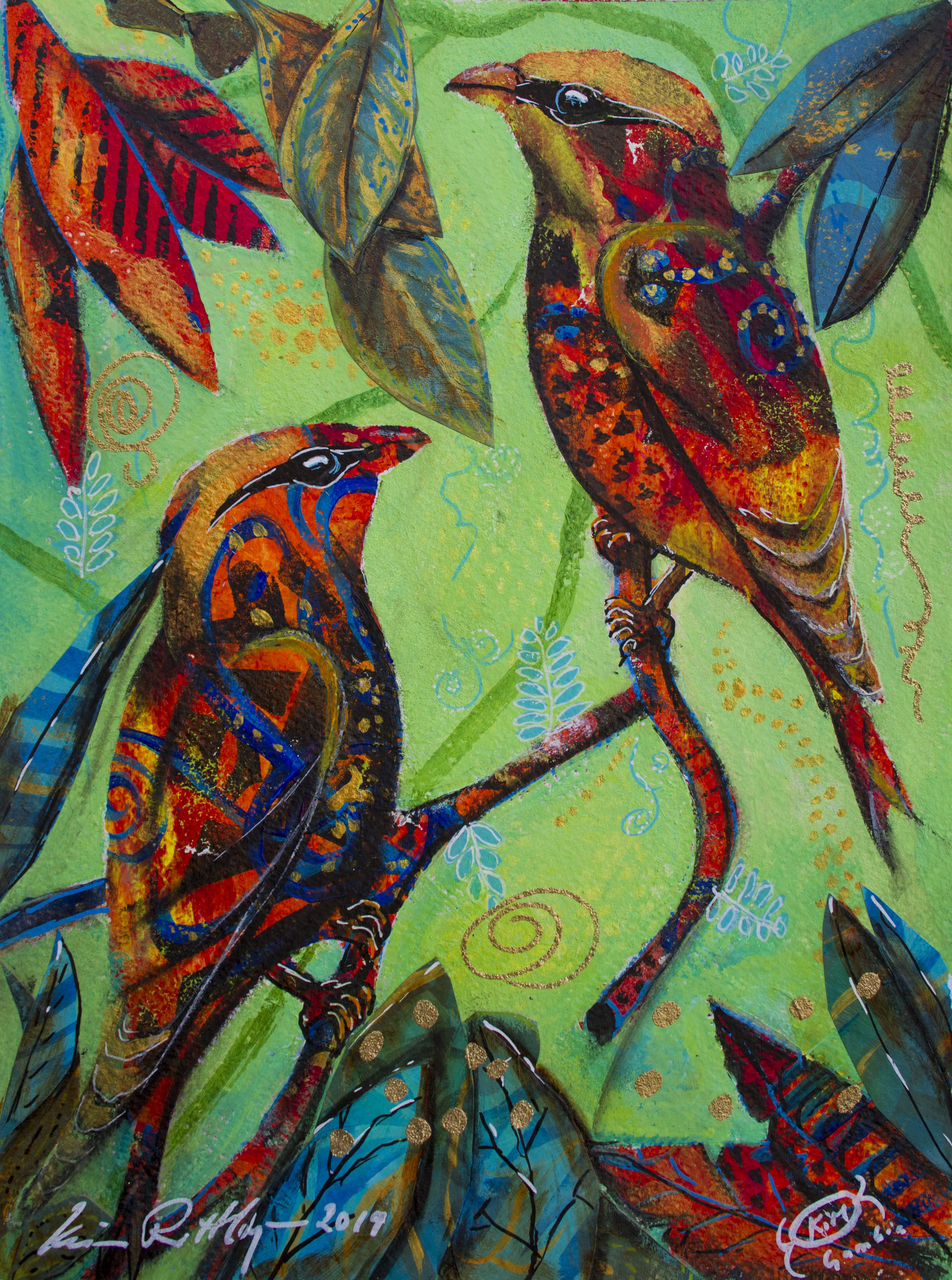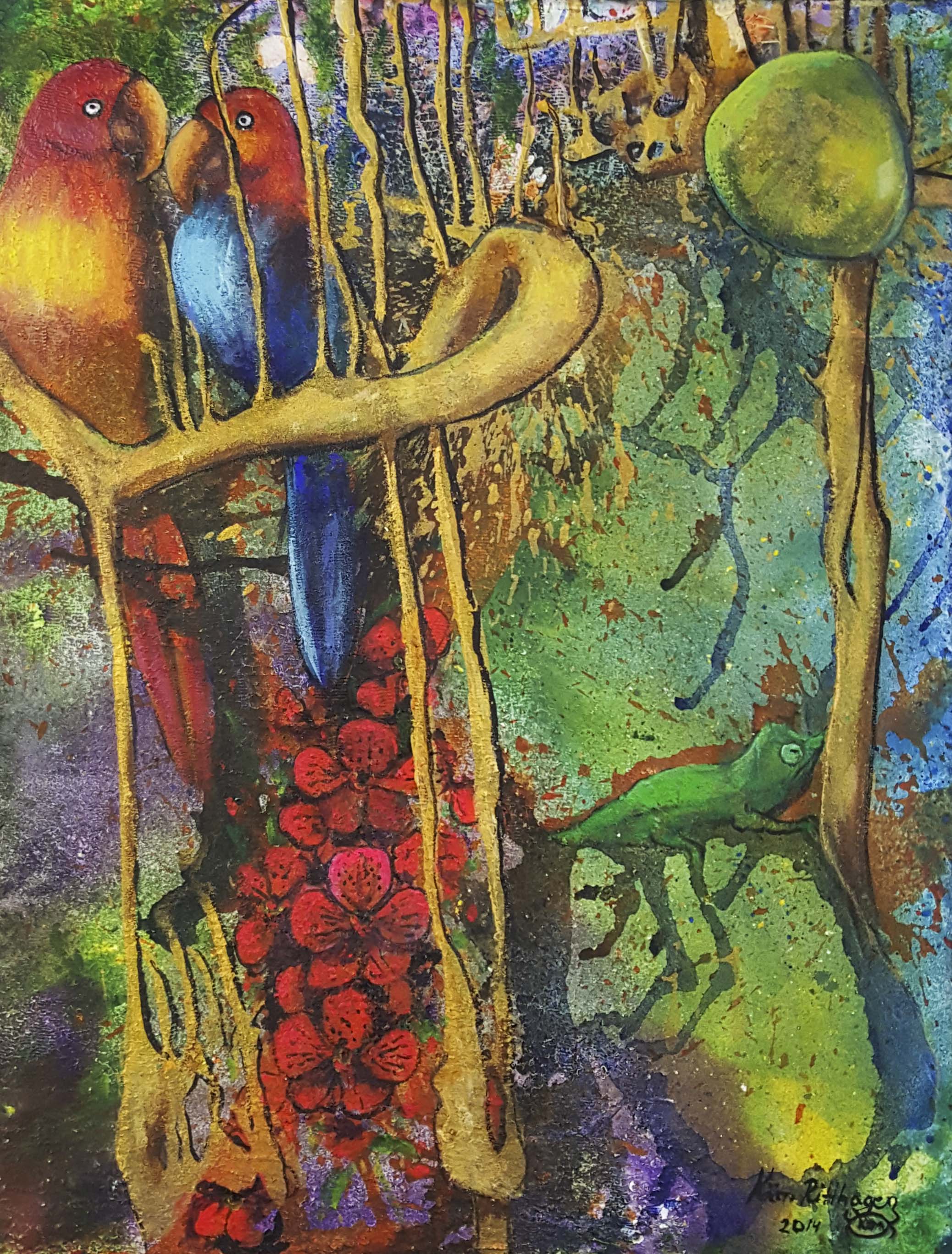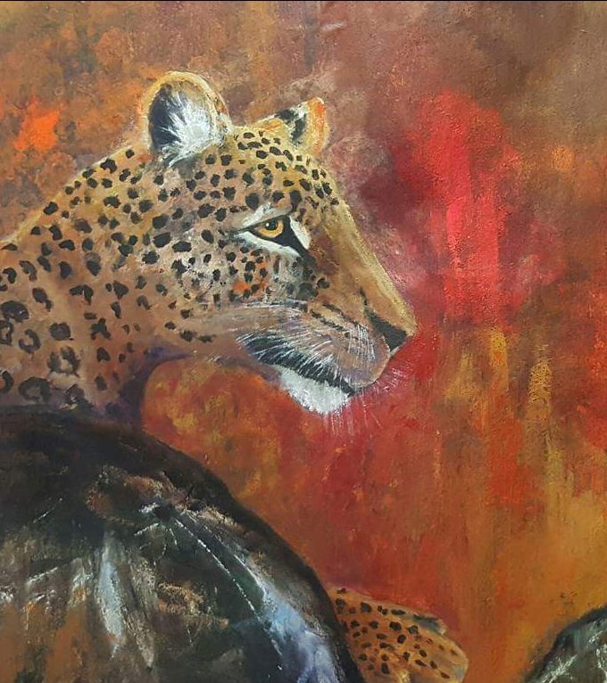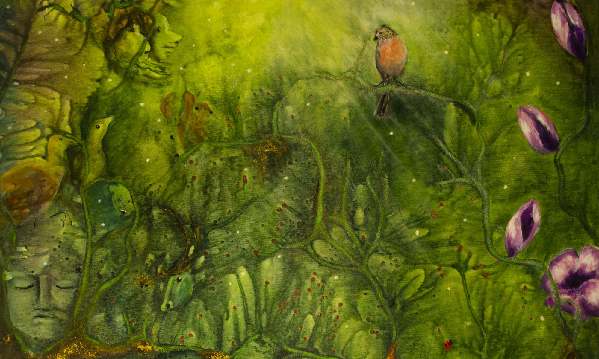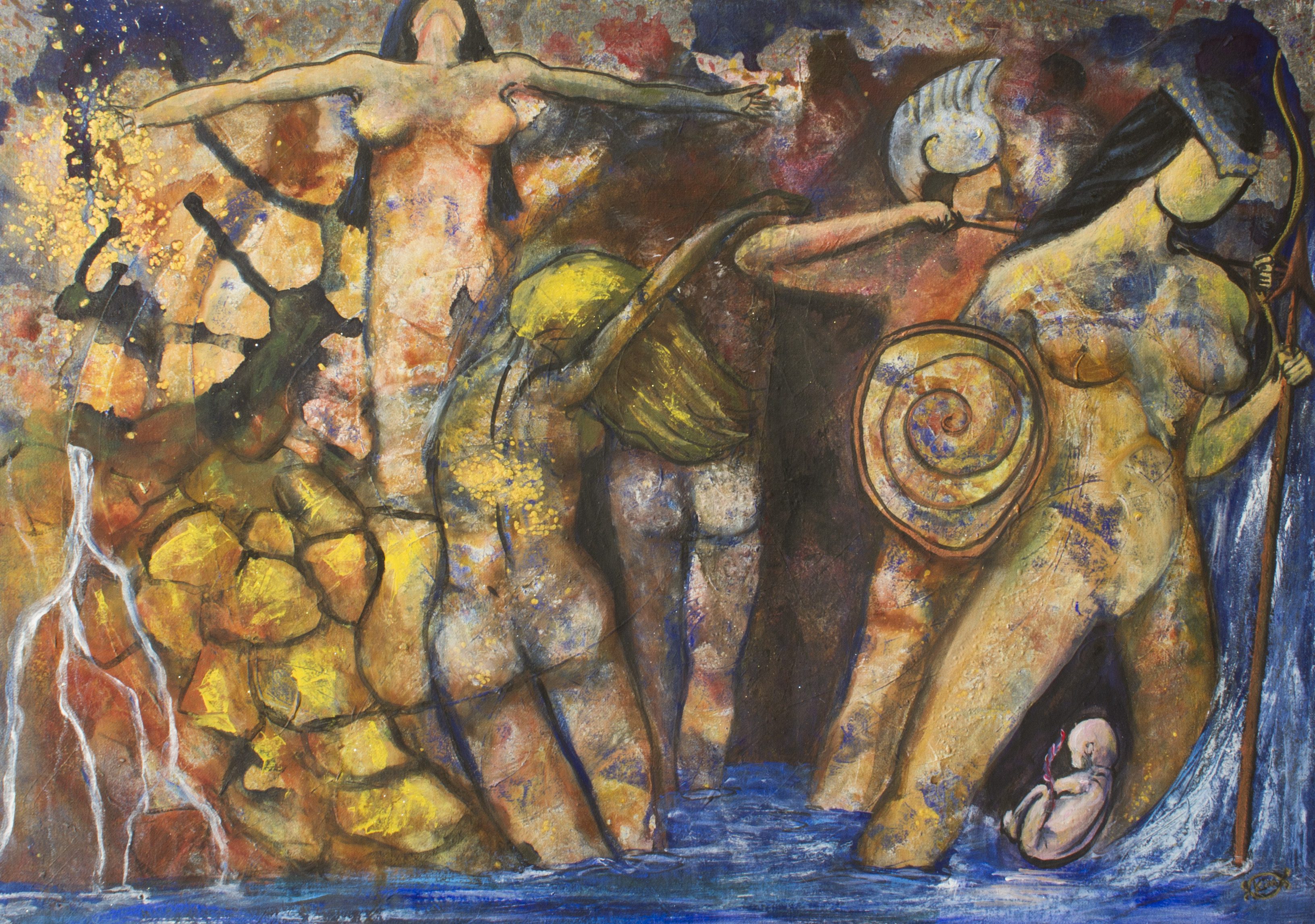 Motiven rör sig mellan natur, mytologi, djur och katter. Ibland är de kraftfulla och intensiva, ibland stilla och drömska. Jag återkommer ofta till symboler och arketypiska gestalter – fåglar, gudinnor, undervattensvarelser, skogens djur. De bär på något tidlöst, något som känns igen även om man inte kan sätta ord på det. Samtidigt finns det alltid en lekfullhet i mina verk. Färgerna får dansa, formerna får överraska, och ibland dyker det upp en katt som bär både humor och självklar värdighet.