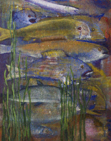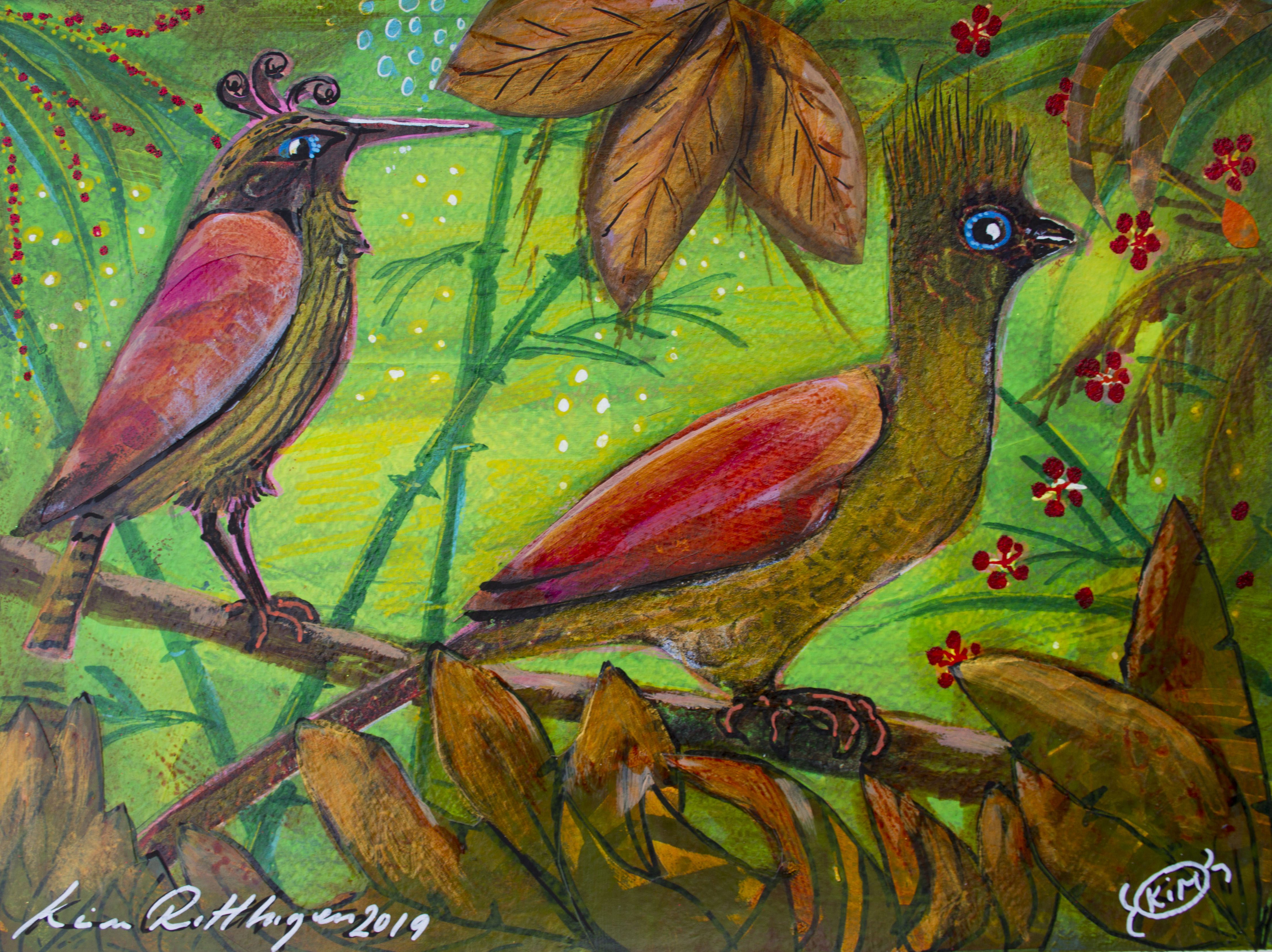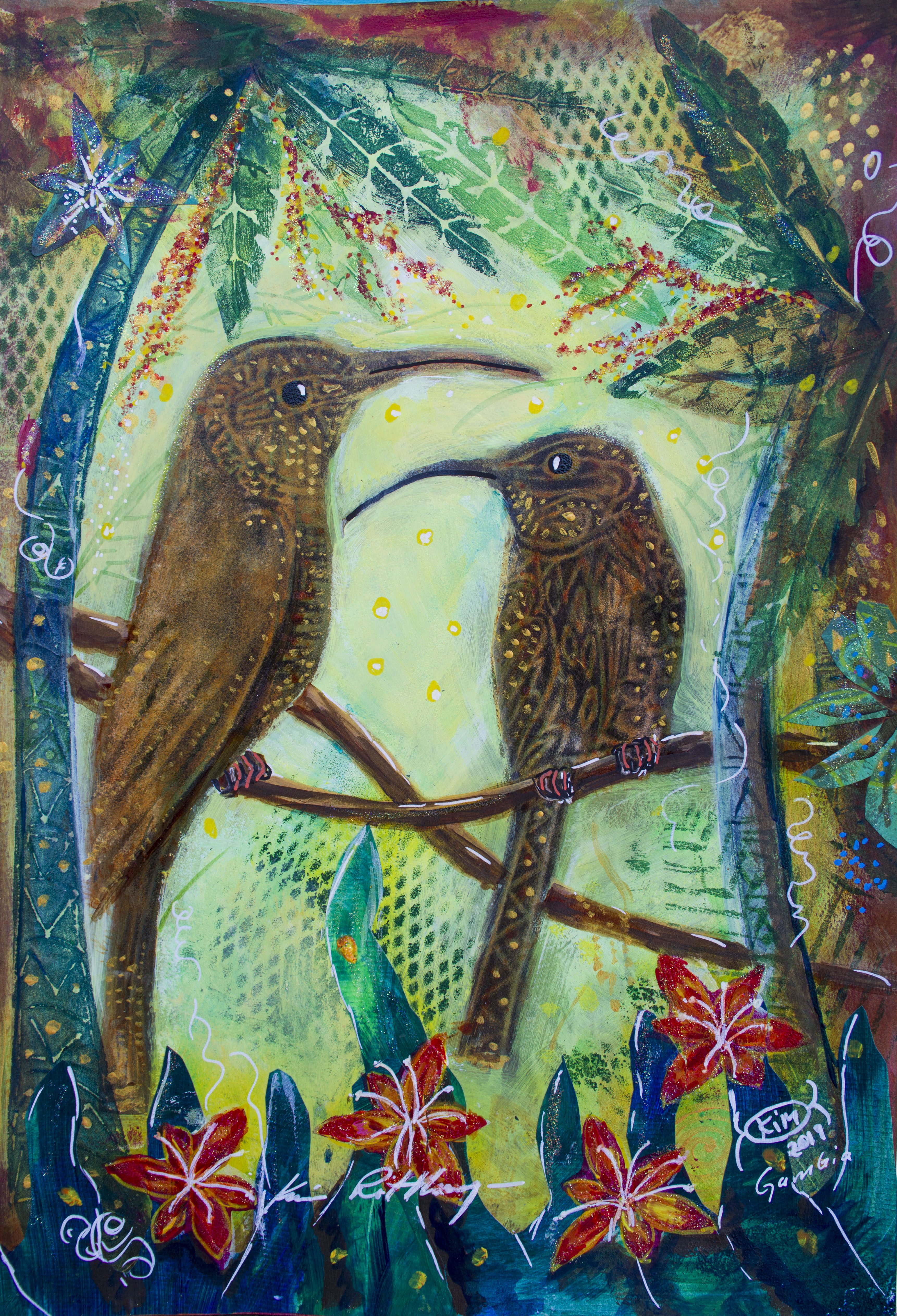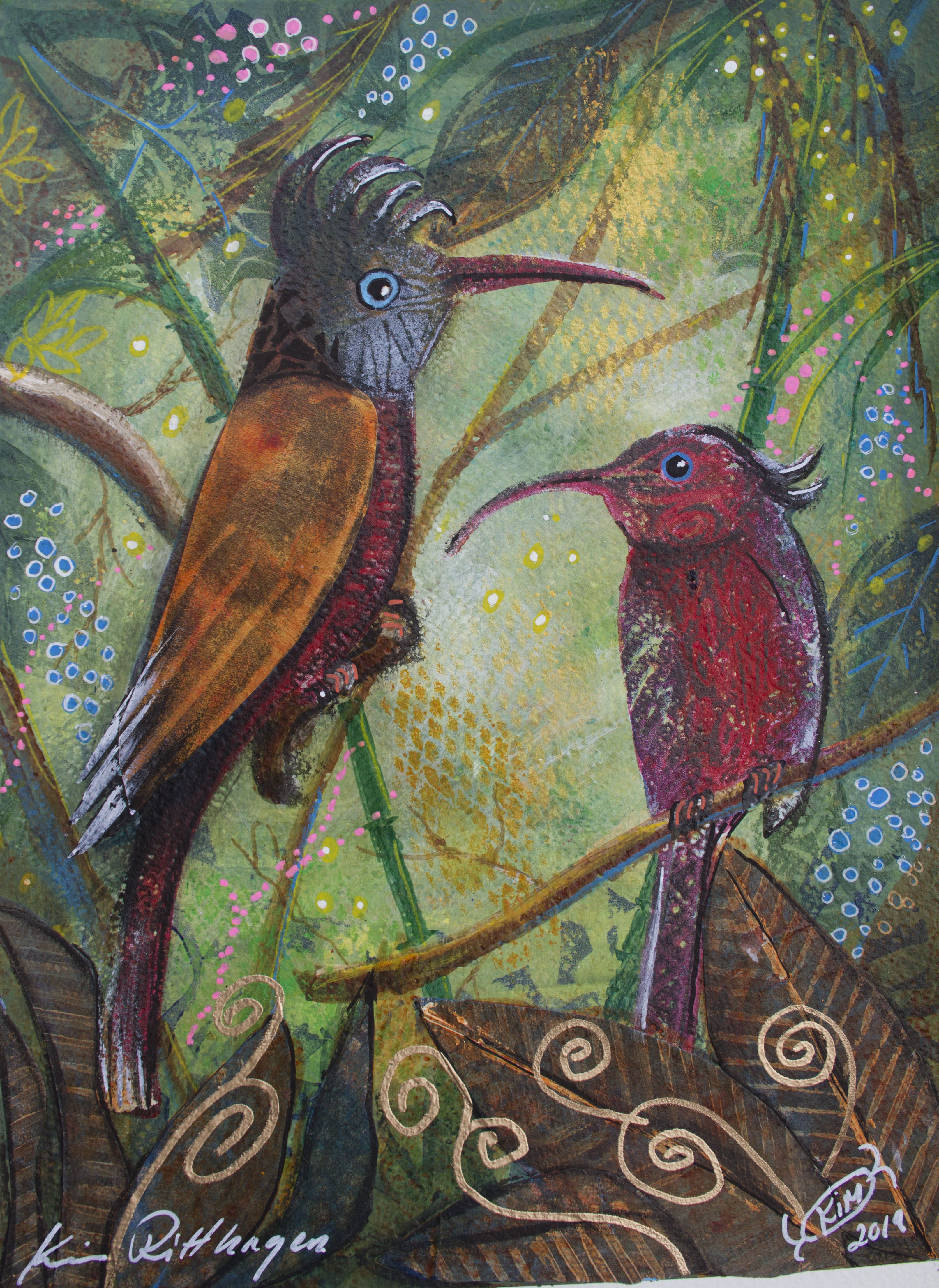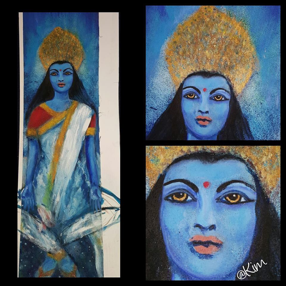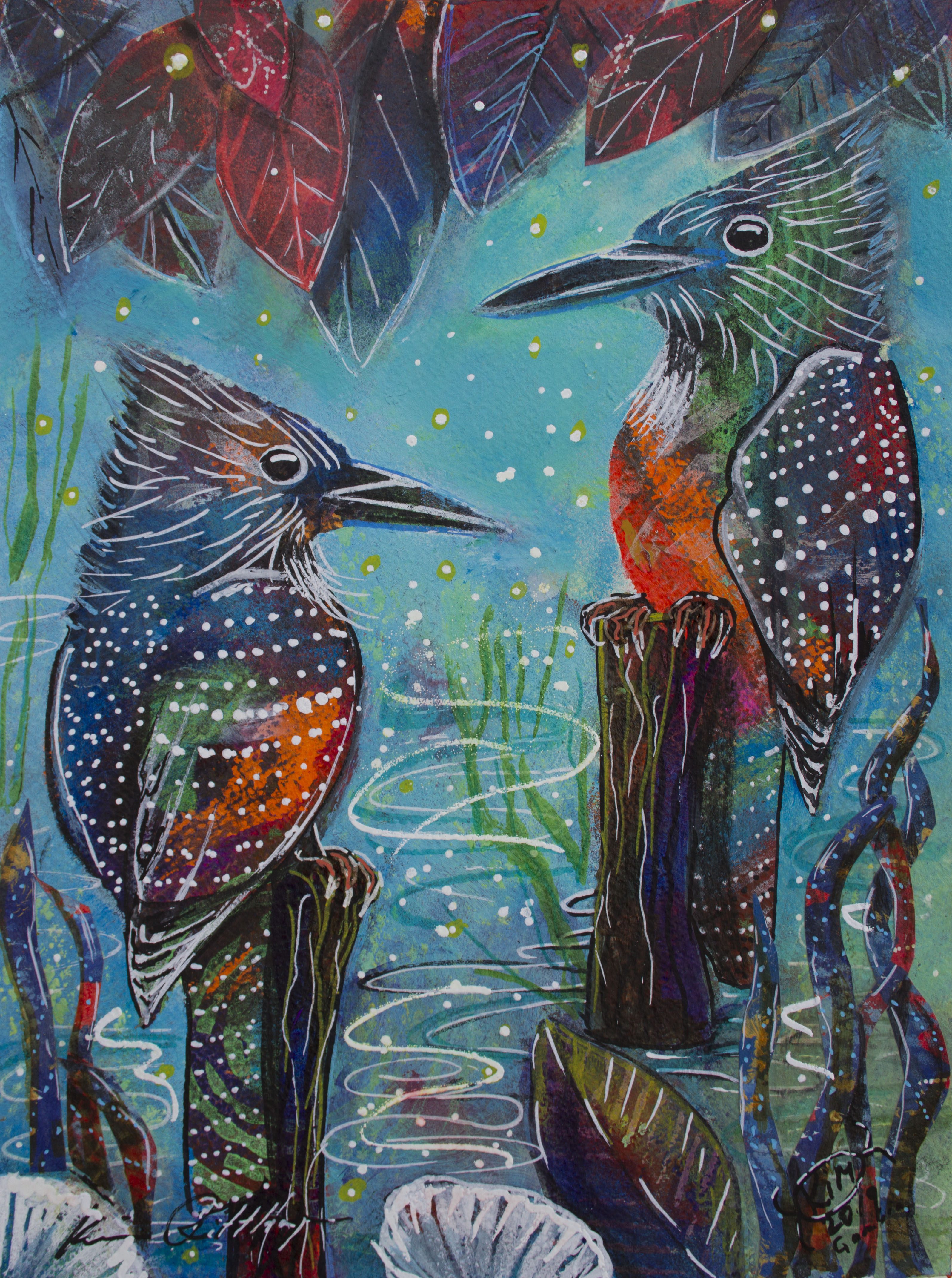 Motiven rör sig mellan natur, mytologi, djur och katter. Ibland är de kraftfulla och intensiva, ibland stilla och drömska. Jag återkommer ofta till symboler och arketypiska gestalter – fåglar, gudinnor, undervattensvarelser, skogens djur. De bär på något tidlöst, något som känns igen även om man inte kan sätta ord på det. Samtidigt finns det alltid en lekfullhet i mina verk. Färgerna får dansa, formerna får överraska, och ibland dyker det upp en katt som bär både humor och självklar värdighet.