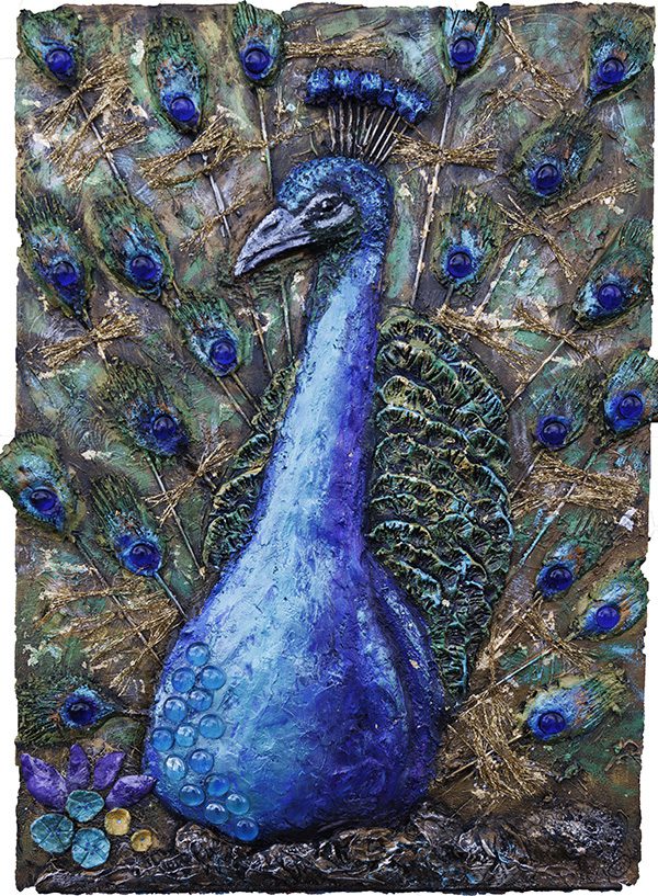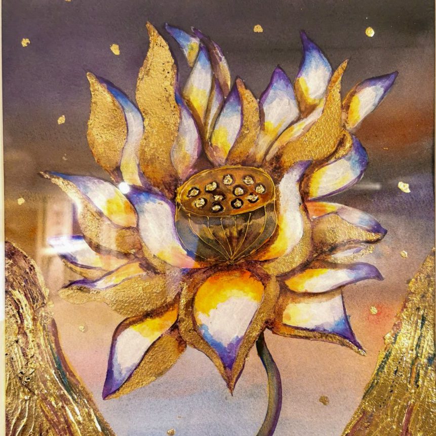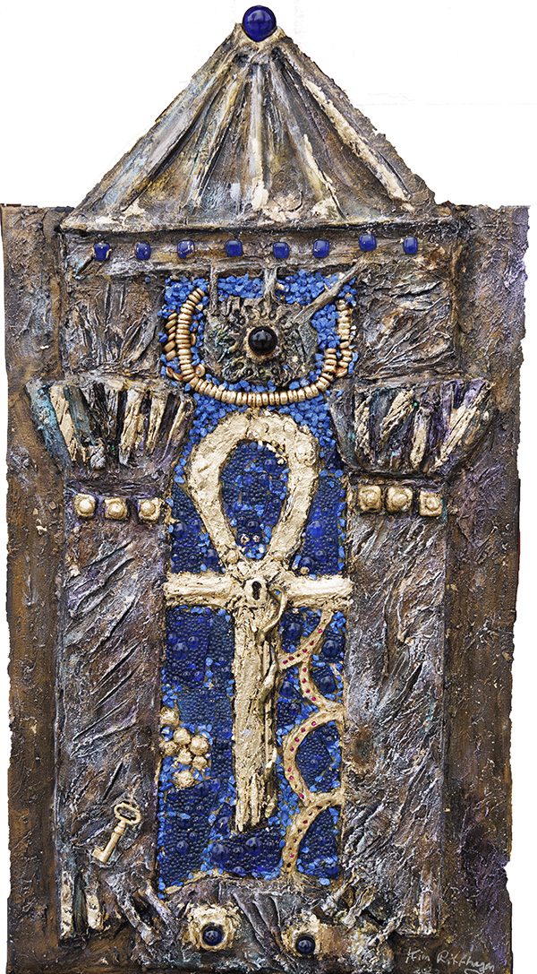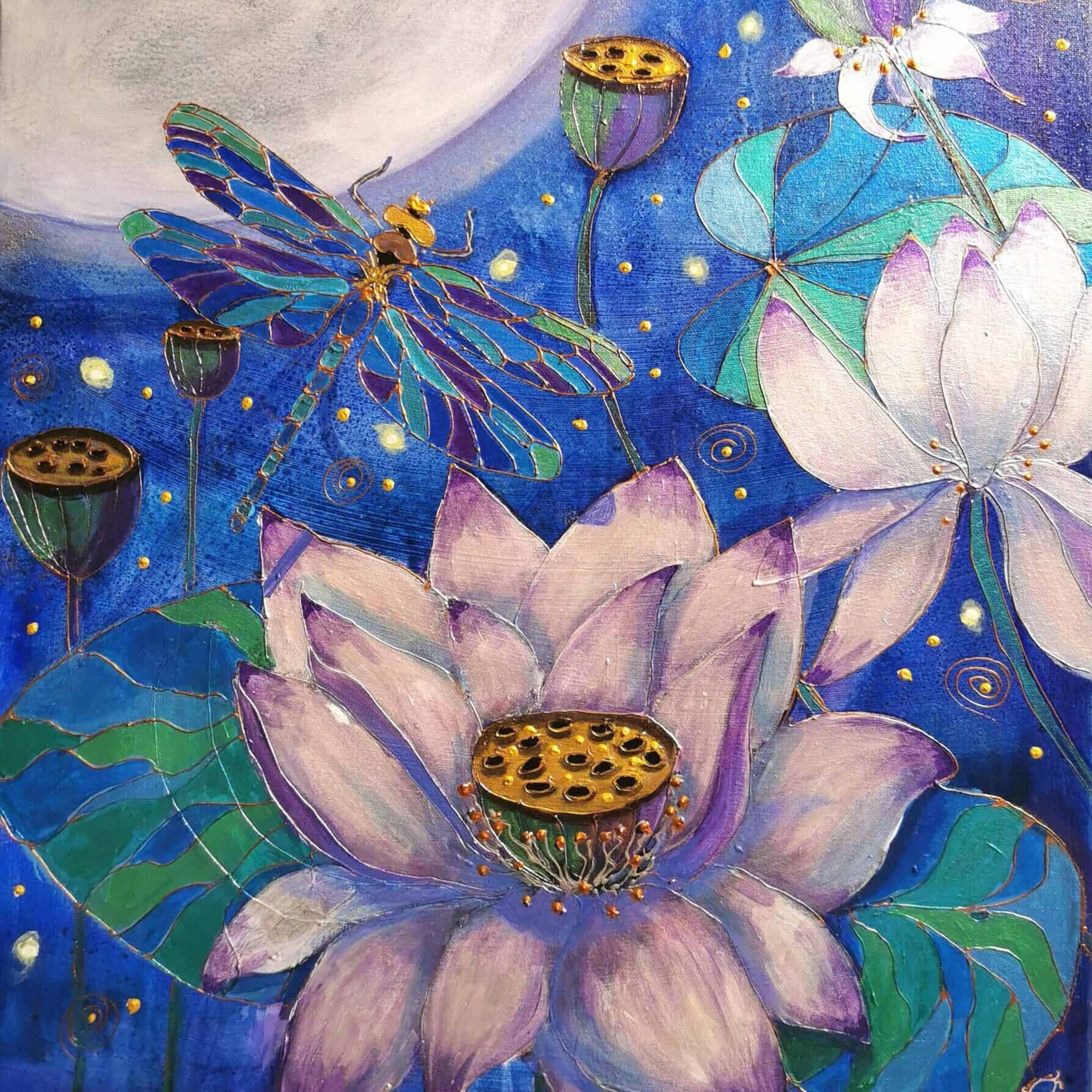 I vissa verk integrerar jag kristaller, glas, mosaik och resinkristaller. De fångar ljuset på ett sätt som gör att målningen förändras beroende på var man står. I några verk använder jag även LED‑ljus för att förstärka känslan av djup och skapa en nästan magisk dimension. Det är tidskrävande arbete, men det är också en av de mest glädjefyllda delarna av min process. Varje lager, varje sten, varje glimt av ljus blir en del av berättelsen.