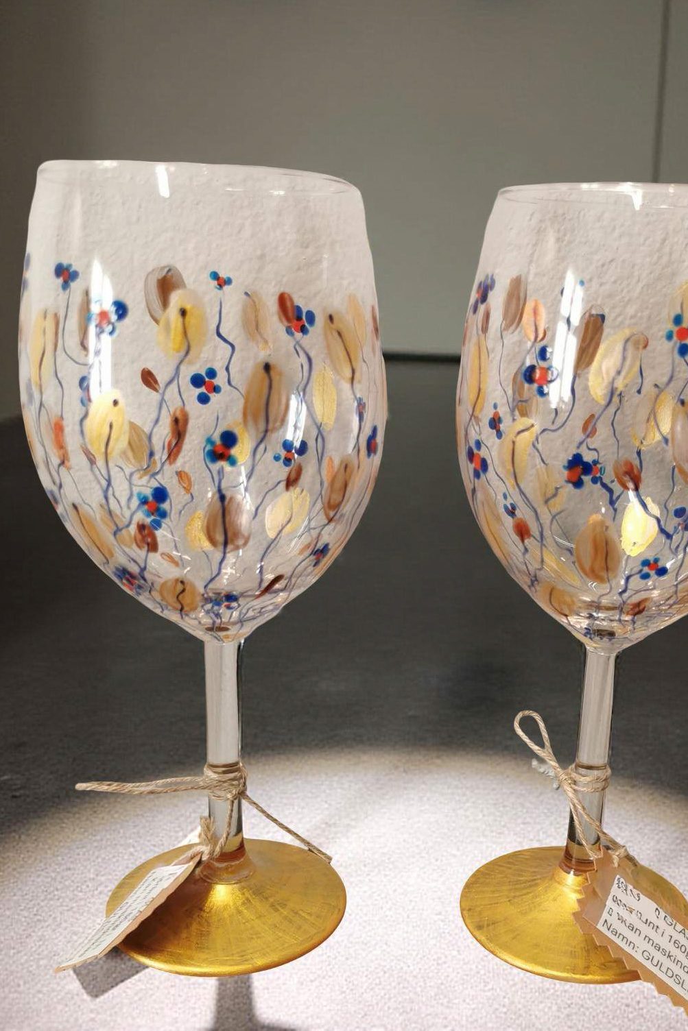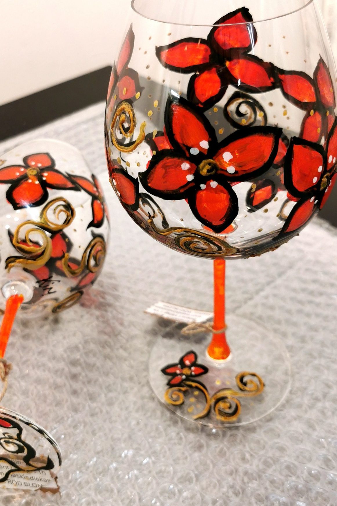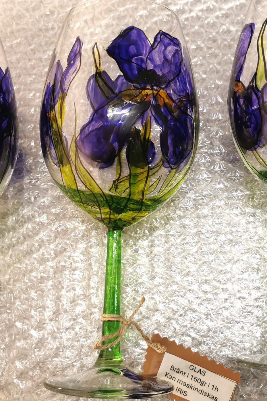 Mina handmålade glas skapas i flera lager på kristallint glas, där varje motiv växer fram under många dagar. Färgen bränns i keramikugn vid 160 grader och varje glas testas i diskmaskin för att säkerställa hållbarhet och kvalitet. Vissa glas frostar jag för hand — dessa ska inte maskindiskas.