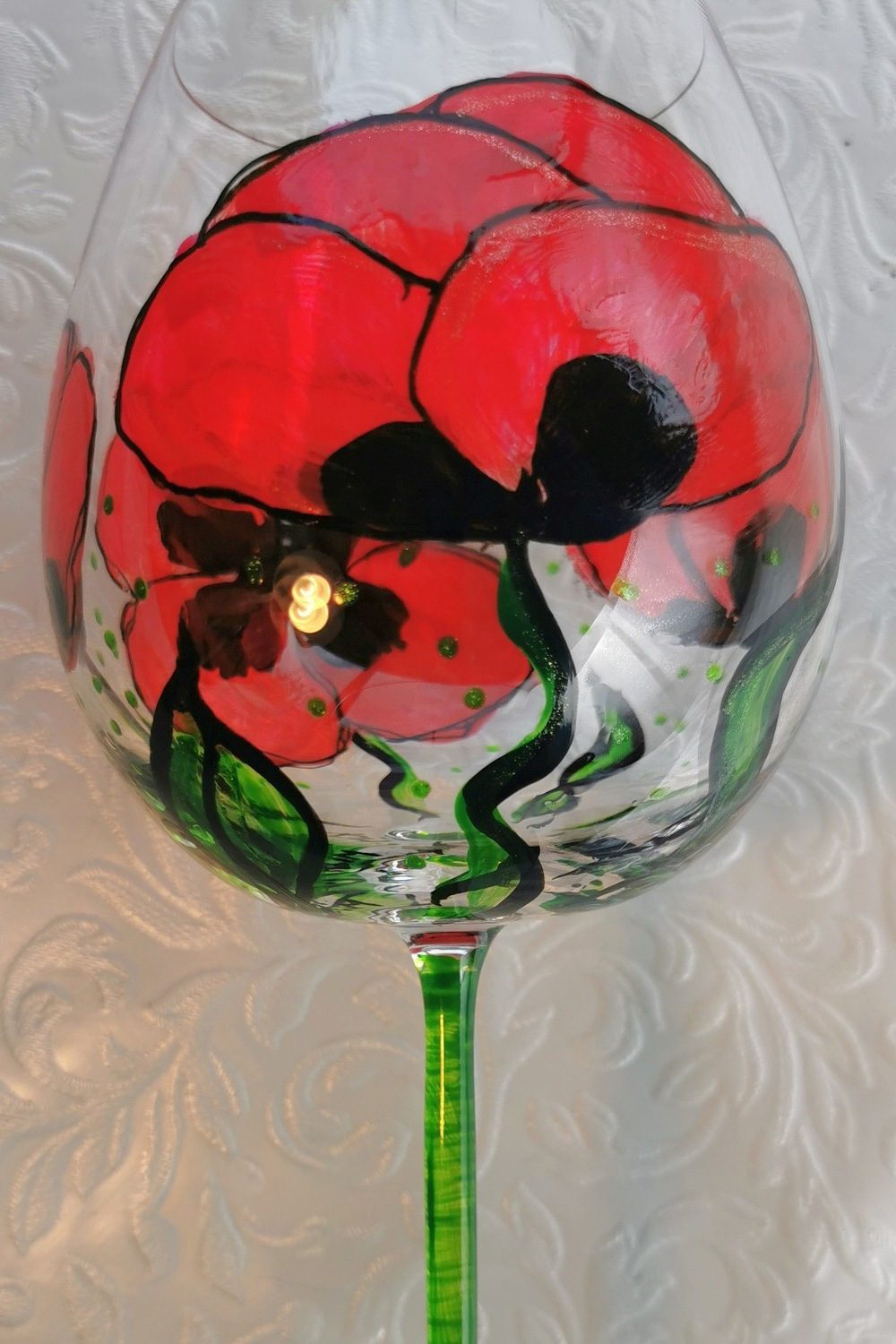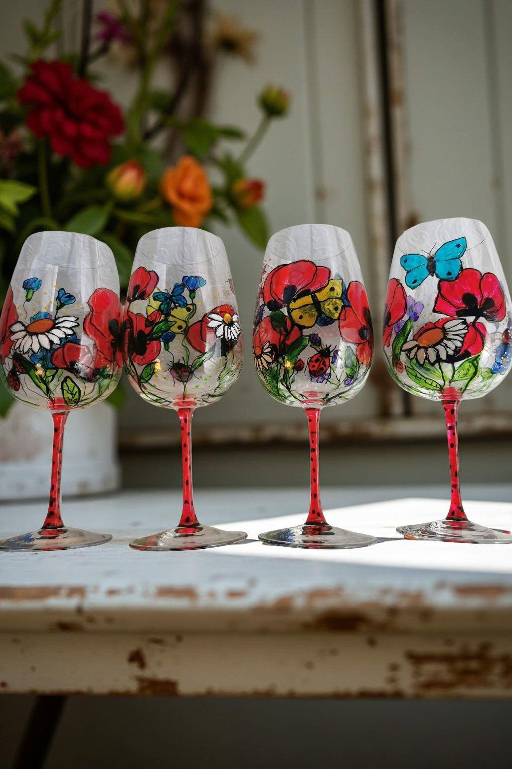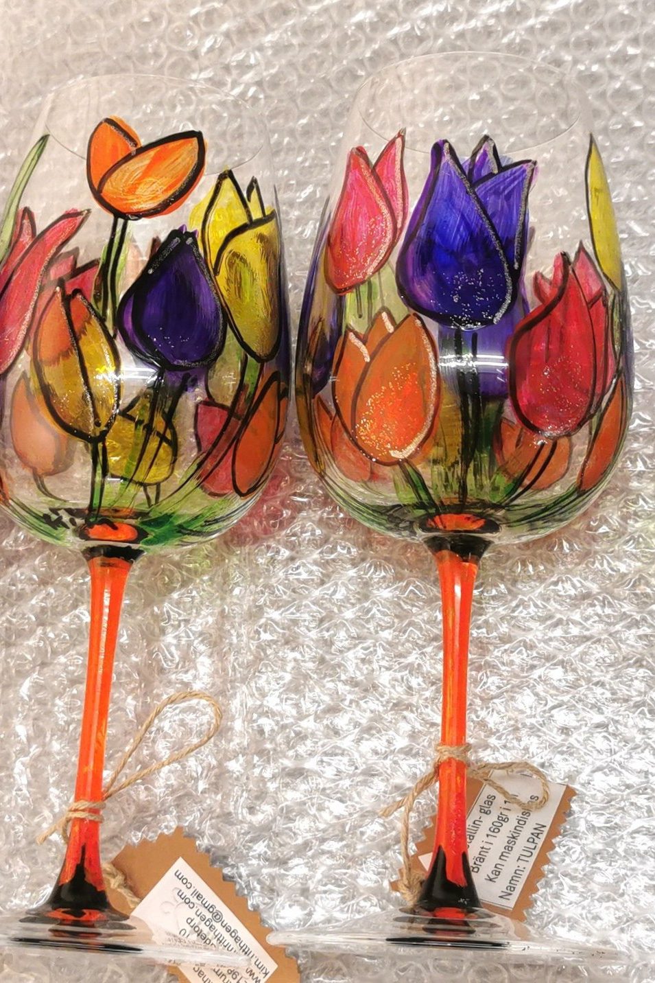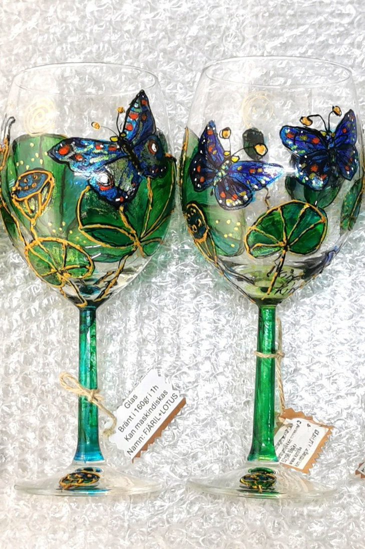 Mina handmålade glas skapas i flera lager på kristallint glas, där varje motiv växer fram under många dagar. Färgen bränns i keramikugn vid 160 grader och varje glas testas i diskmaskin för att säkerställa hållbarhet och kvalitet. Vissa glas frostar jag för hand — dessa ska inte maskindiskas.