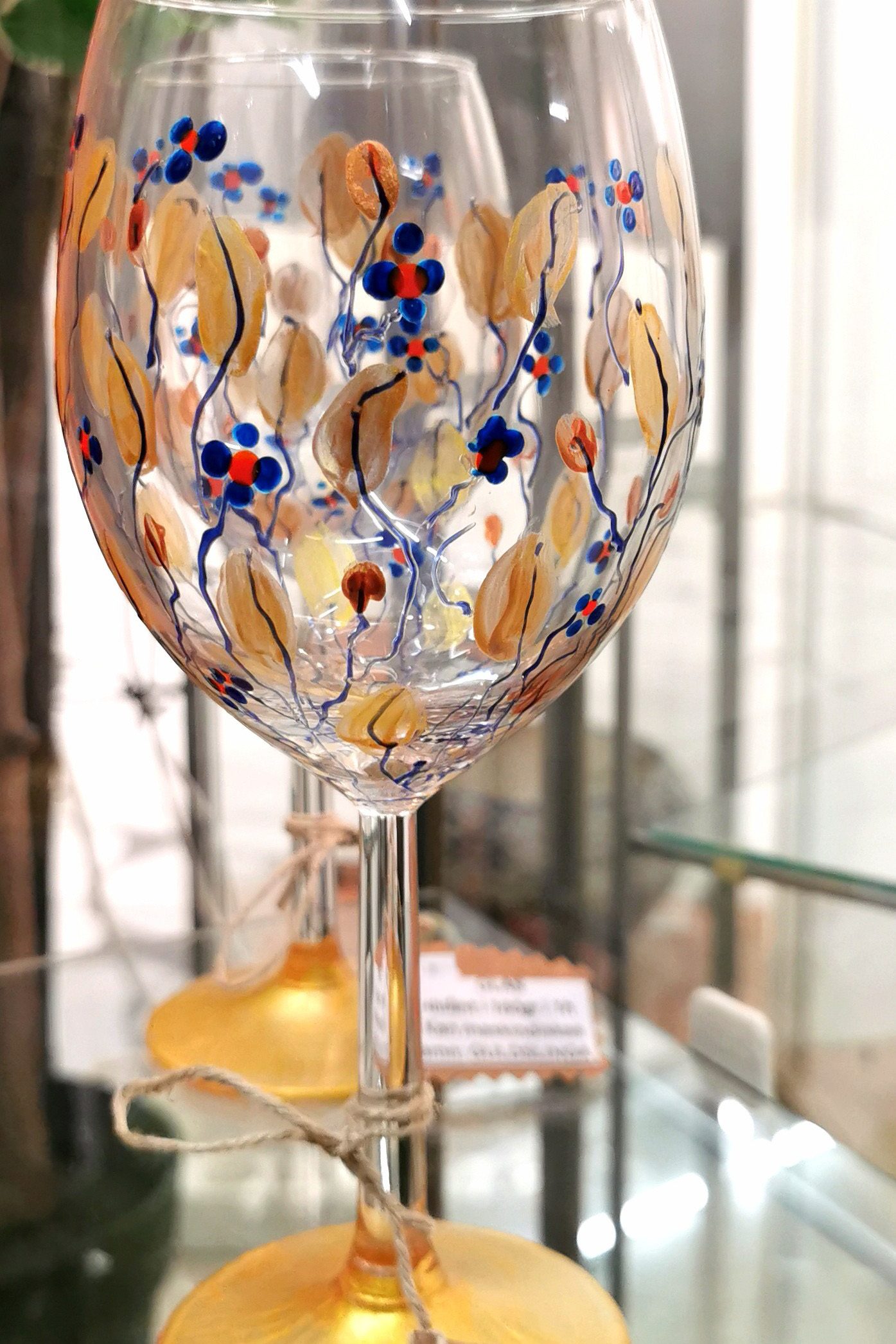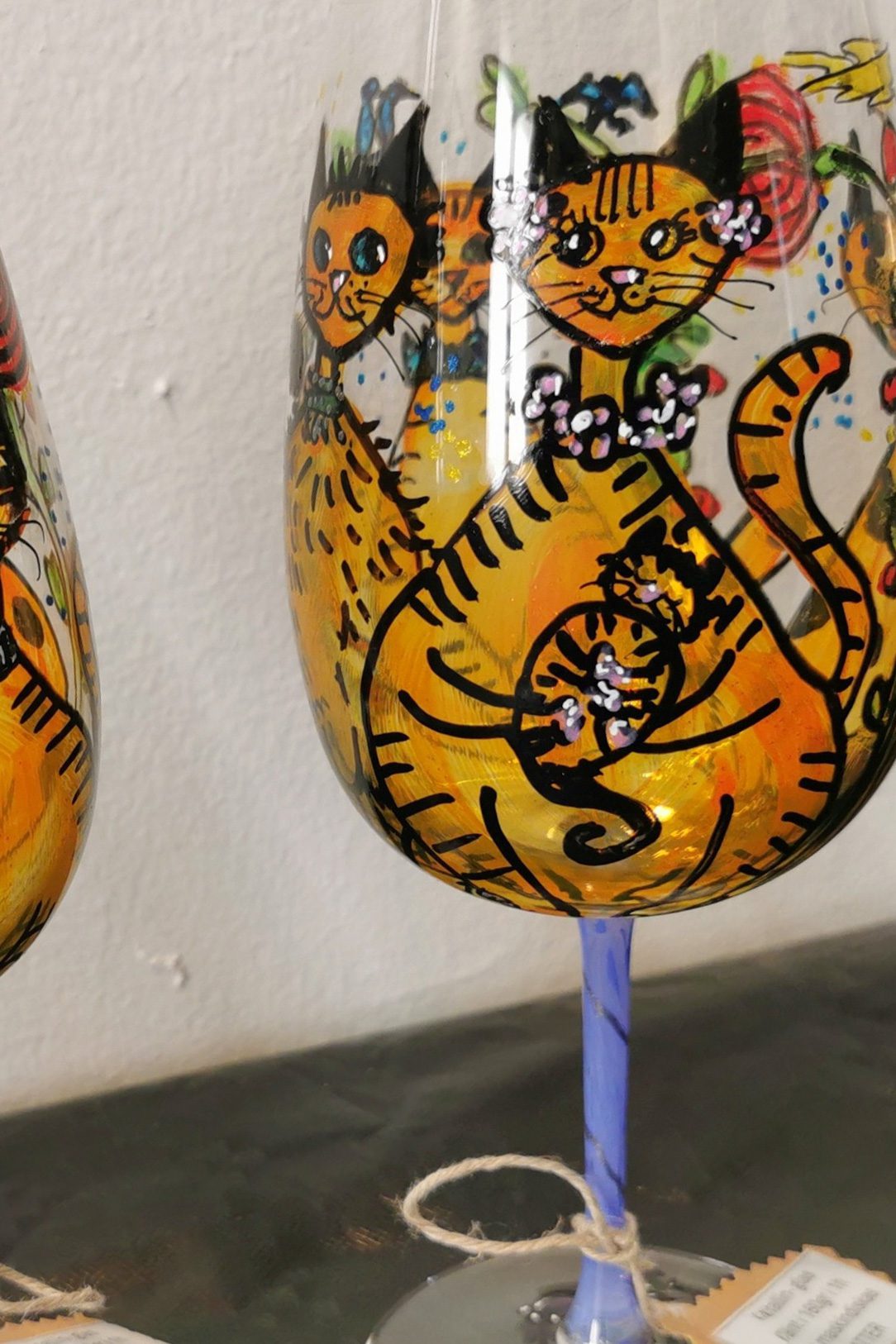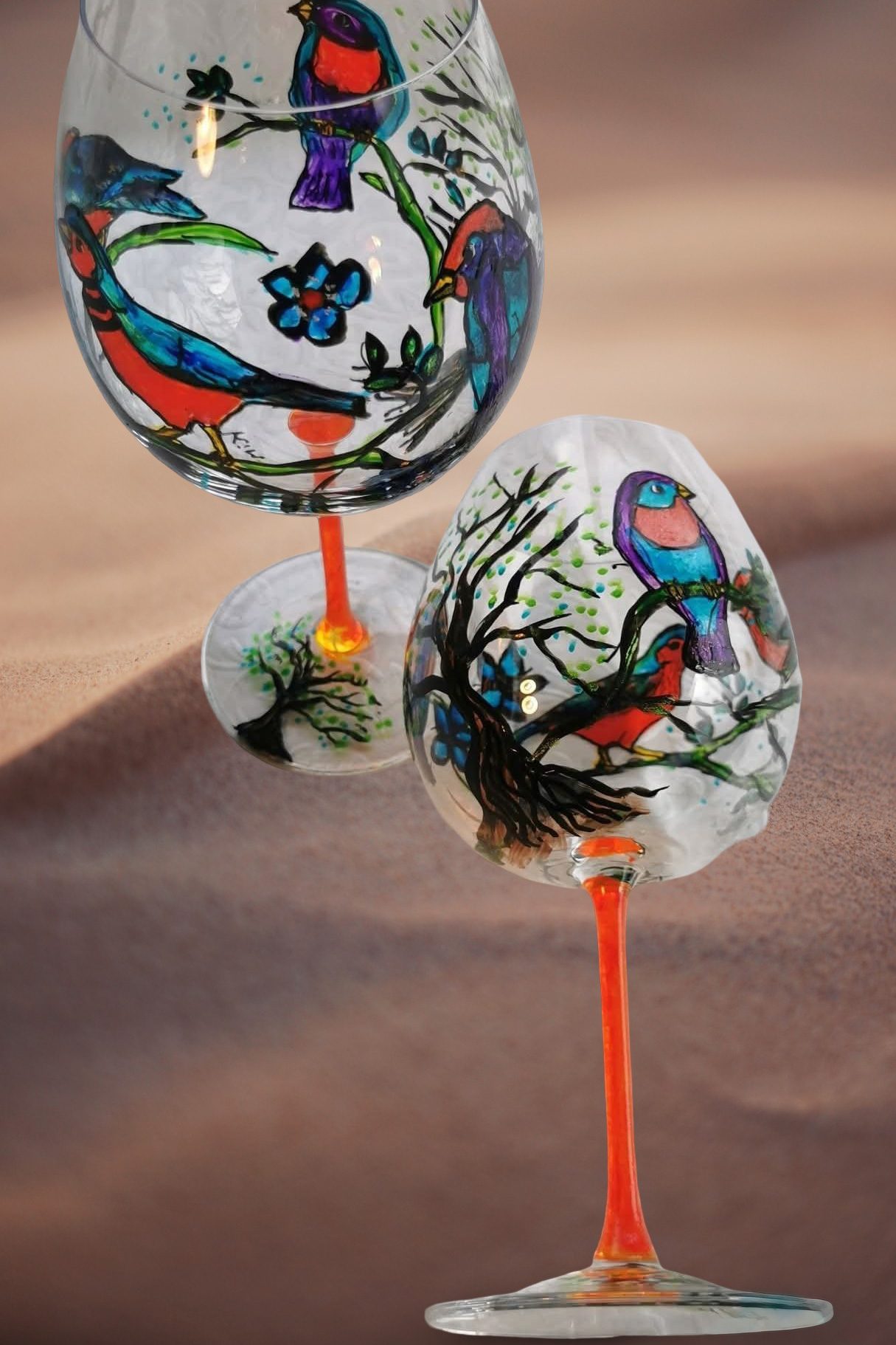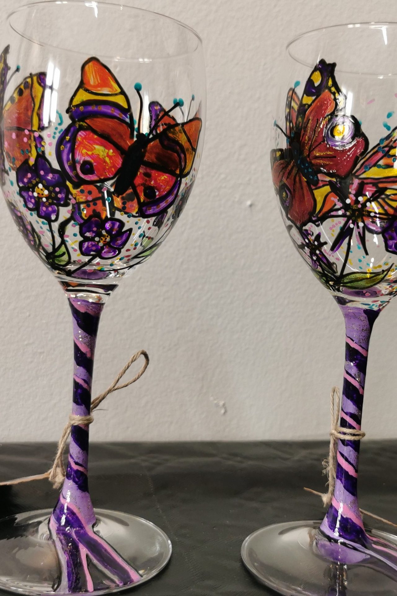 Jag arbetar med guld, silver, pärlemor och ibland relief i metallfärger. Motiven hämtas ofta från naturen: druvor, blommor, fåglar, fjärilar, trollsländor, mönster, katter och ansikten. Varje glas får tre motiv som tillsammans bildar en liten berättelse, och jag målar även på stammen och foten. Alla glas signeras med KIM. Beställningar är möjliga och kan anpassas efter önskat motiv.