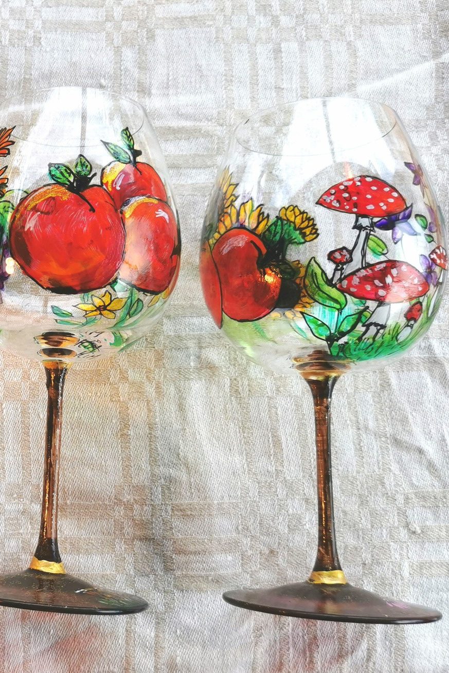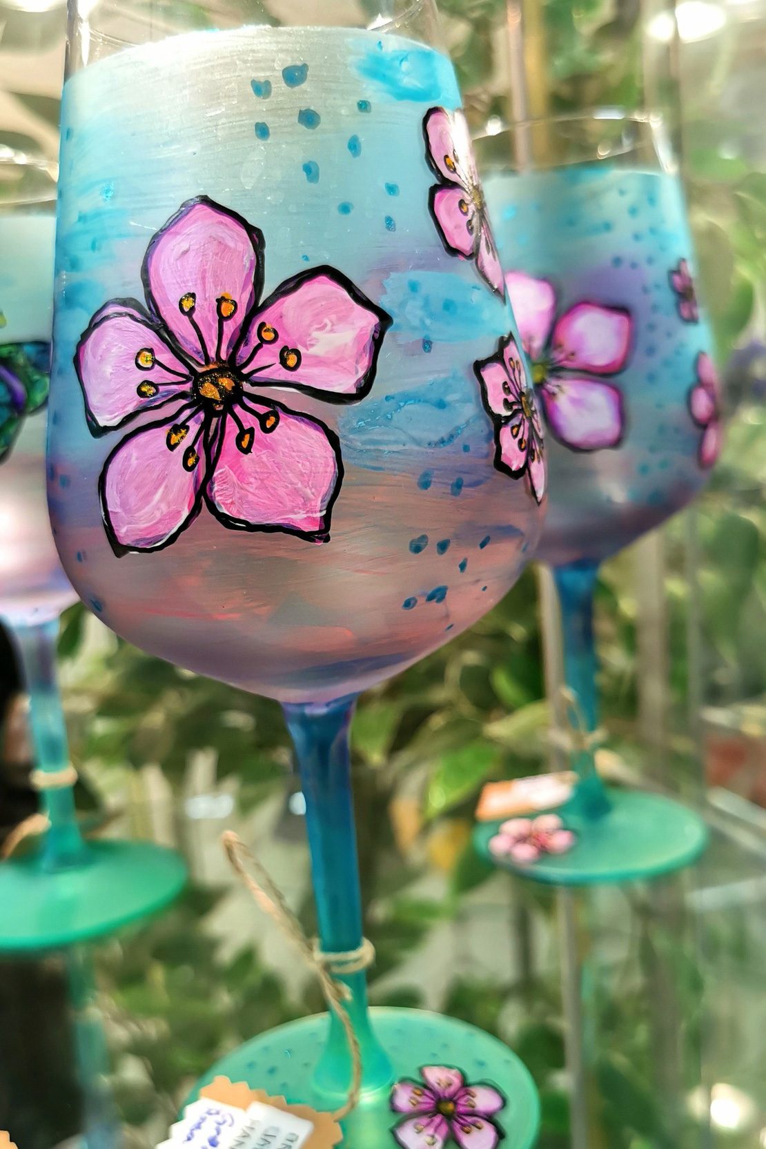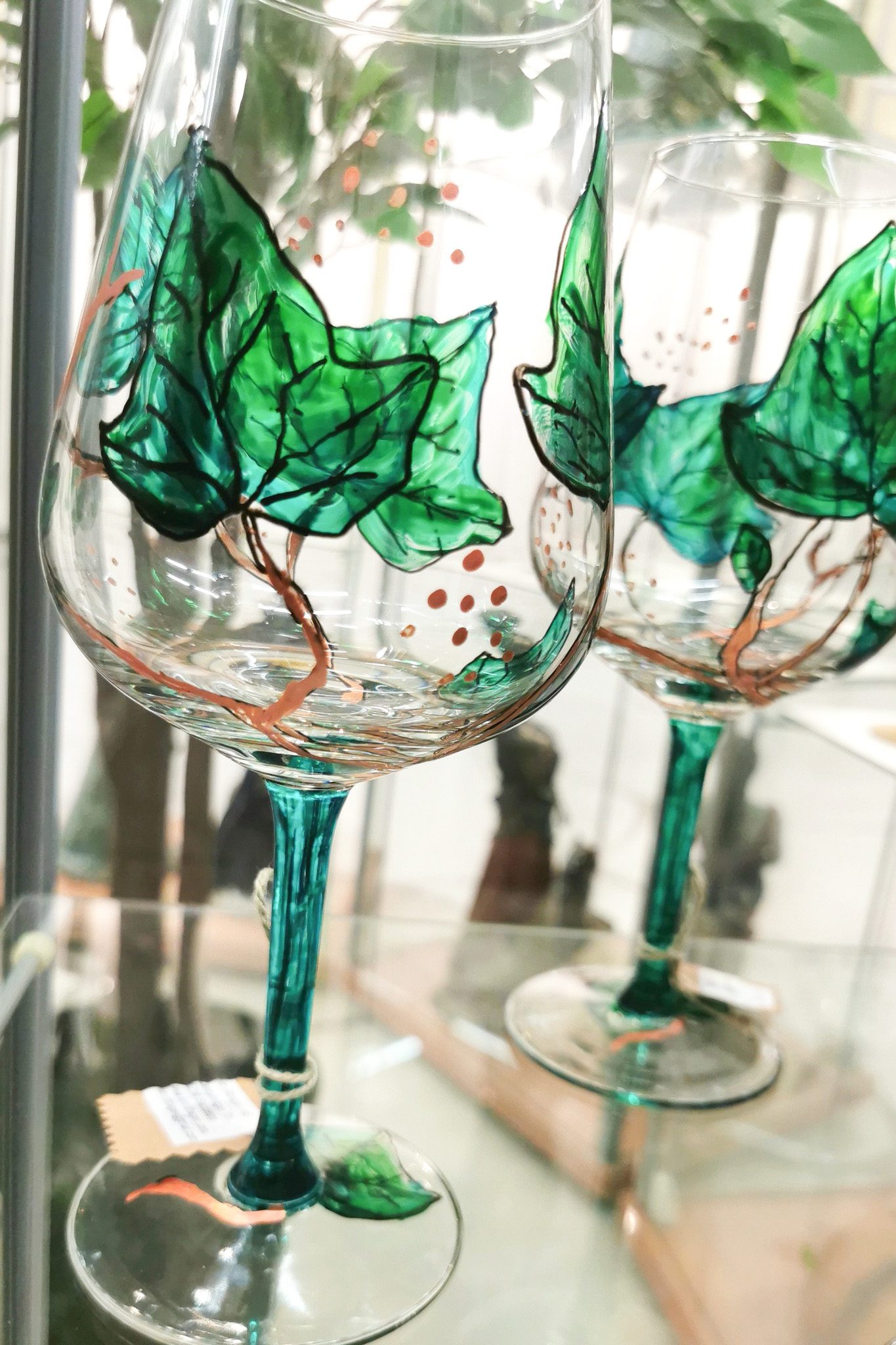 Jag arbetar med guld, silver, pärlemor och ibland relief i metallfärger. Motiven hämtas ofta från naturen: druvor, blommor, fåglar, fjärilar, trollsländor, mönster, katter och ansikten. Varje glas får tre motiv som tillsammans bildar en liten berättelse, och jag målar även på stammen och foten. Alla glas signeras med KIM. Beställningar är möjliga och kan anpassas efter önskat motiv.