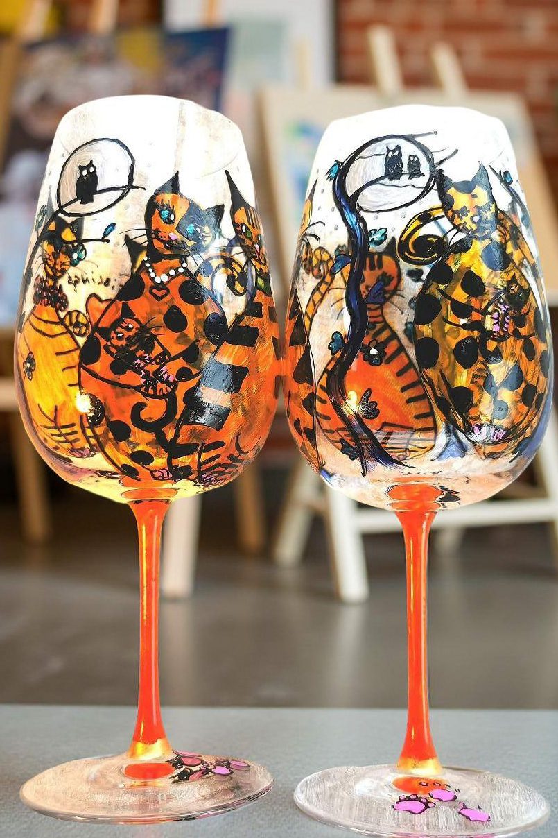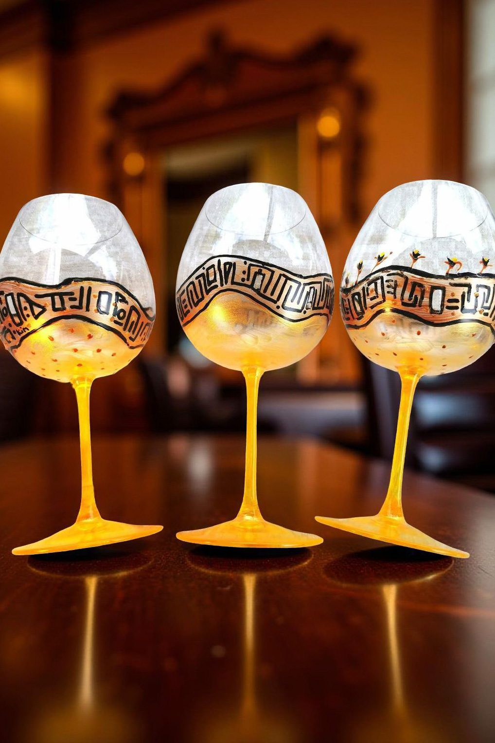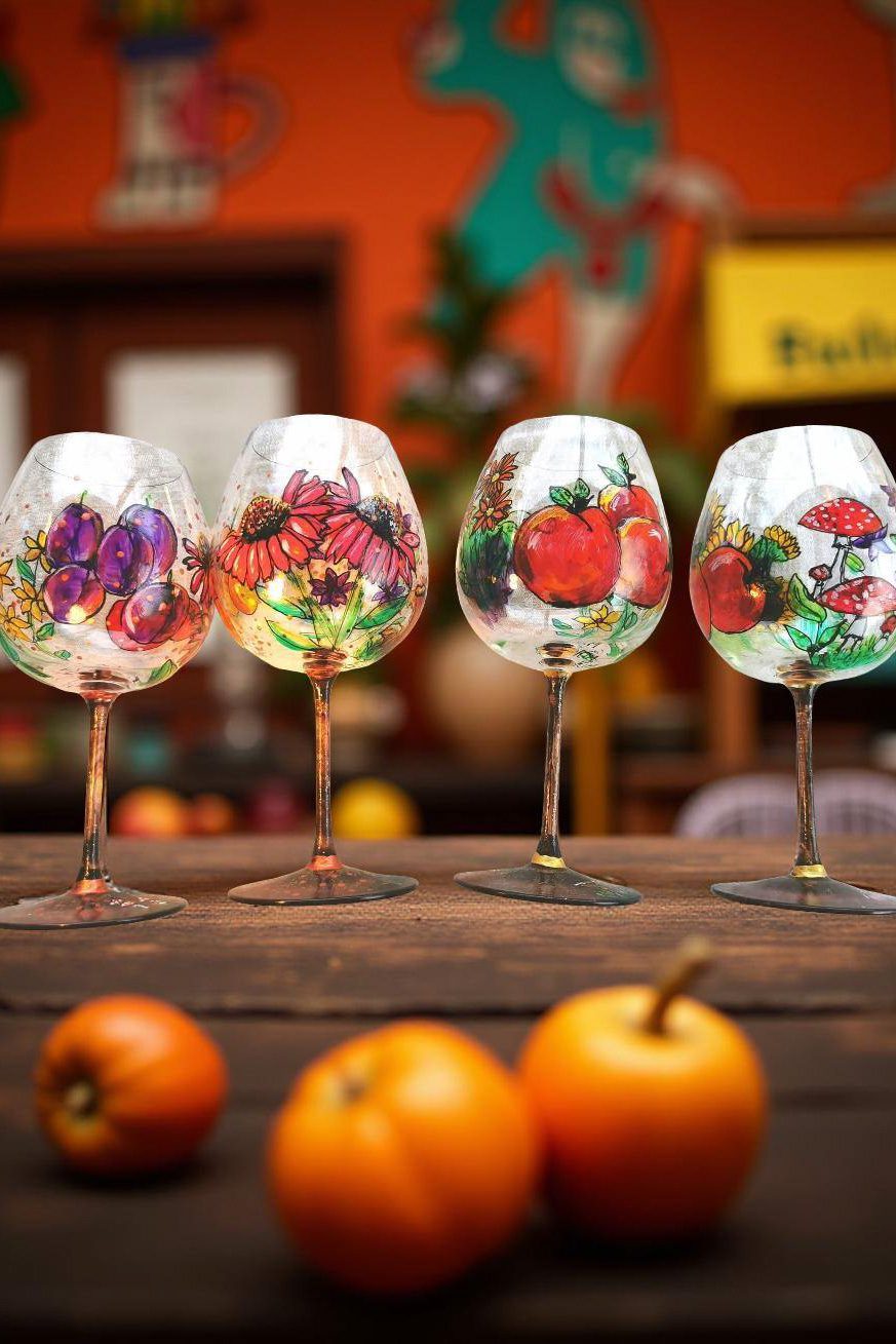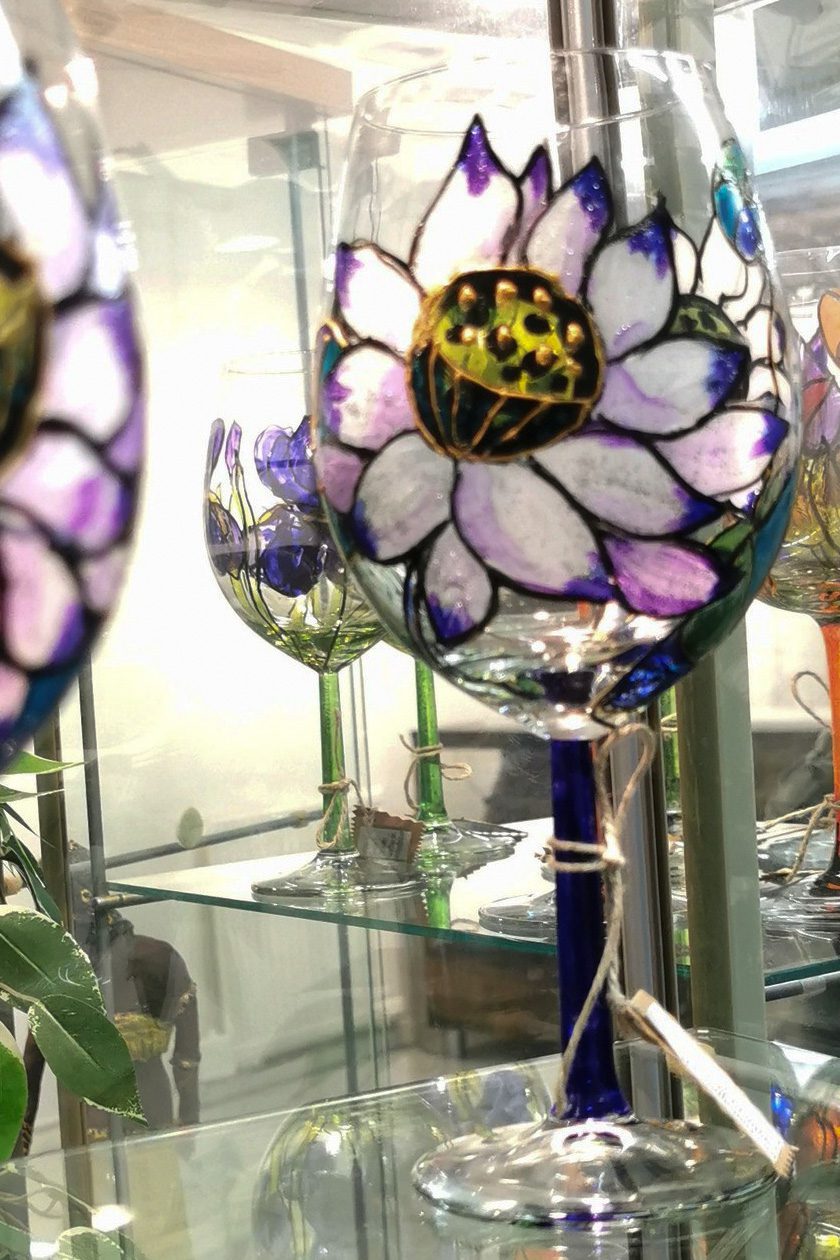 Jag arbetar med guld, silver, pärlemor och ibland relief i metallfärger. Motiven hämtas ofta från naturen: druvor, blommor, fåglar, fjärilar, trollsländor, mönster, katter och ansikten. Varje glas får tre motiv som tillsammans bildar en liten berättelse, och jag målar även på stammen och foten. Alla glas signeras med KIM. Beställningar är möjliga och kan anpassas efter önskat motiv.