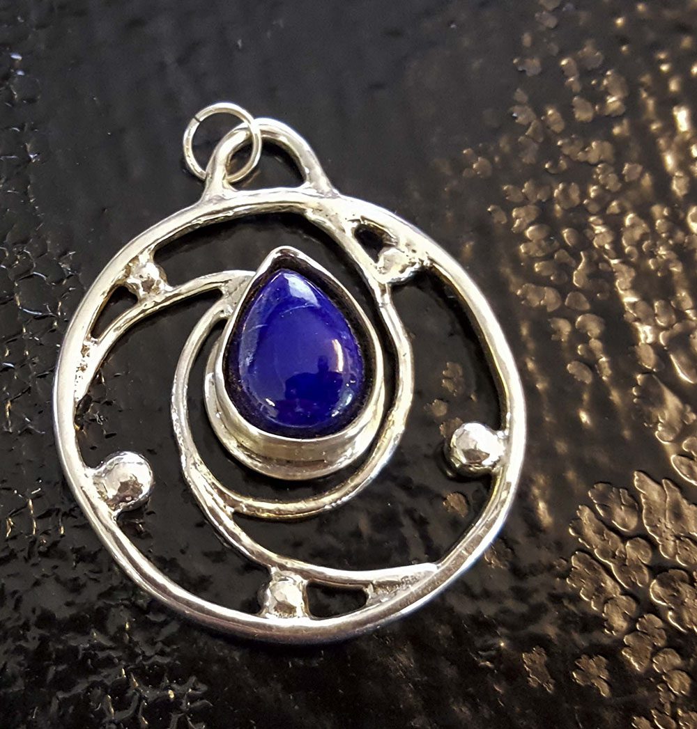 Jag använder kraftfulla stenar som labradorit, karneol, lapis lazuli, tektiter (från meteoriter) och tanzanit. Symbolerna hämtar jag från kelterna, Egypten och Indien – och varje smycke bär en tydlig energi och ett eget uttryck.