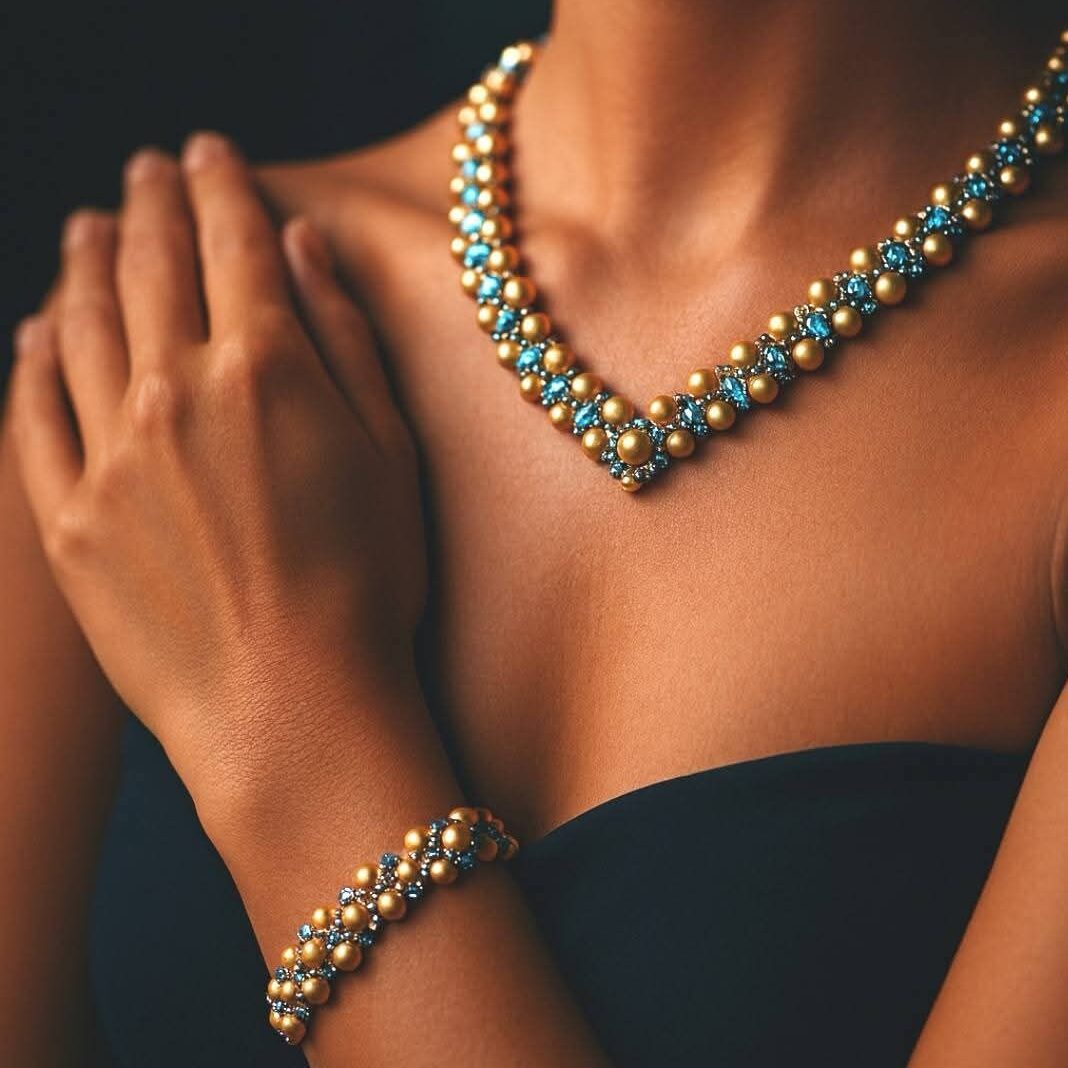Pärlbroderierna är ett eget universum – armband, halsband, ringar och örhängen i intrikata mönster där jag ofta kombinerar pärlor med metall och halvädelstenar. Varje stygn bygger struktur, färg och rytm, och resultatet blir smycken som bär både mjukhet och styrka.
